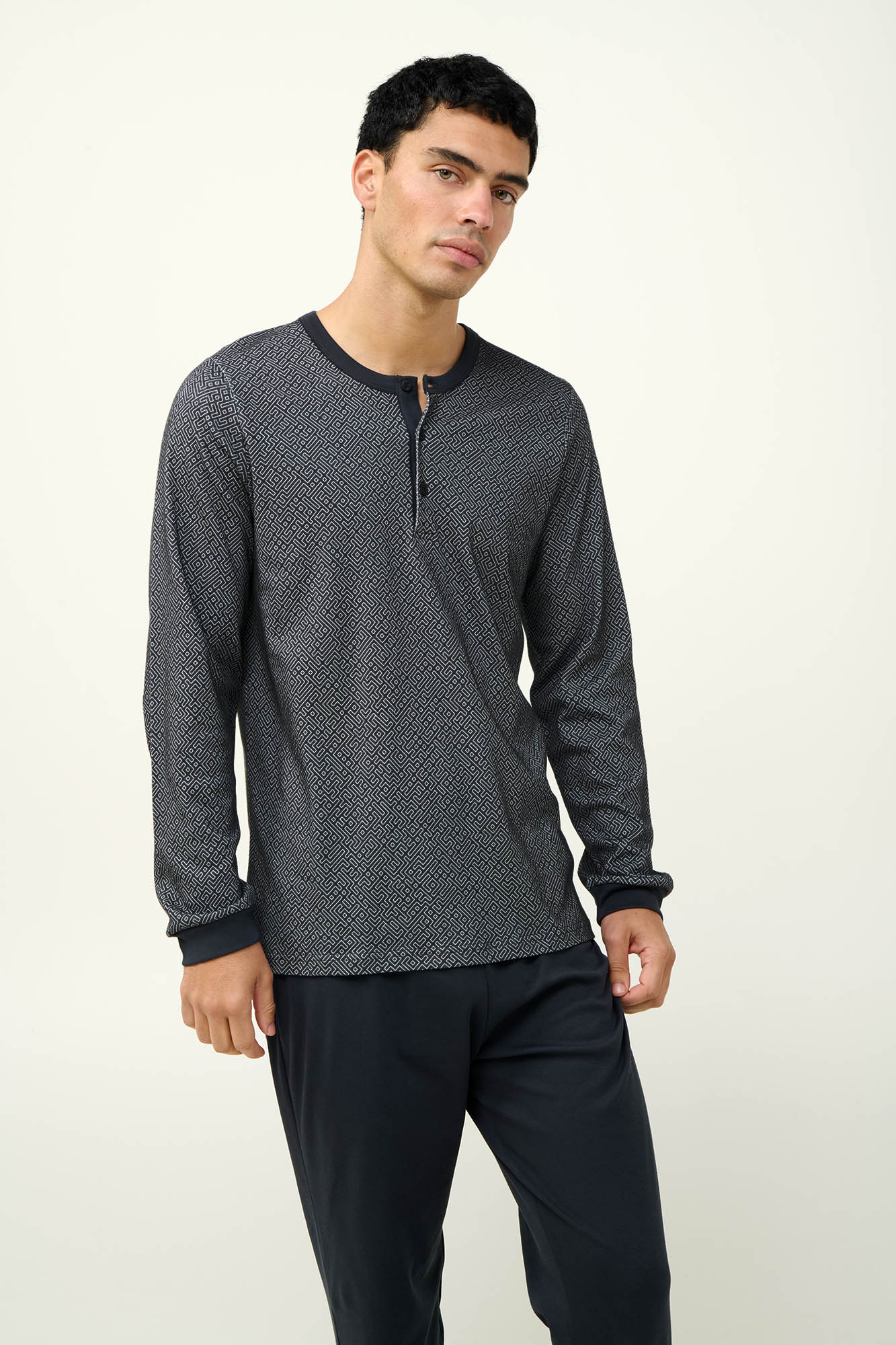 Προσθέστε στη γκαρνταρόμπα σας αυτές τις ανδρικές χειμερινές πυτζάμες από 100% βαμβάκι interlock, που προσφέρουν απαλότητα και διαπνοή. Το πάνω μέρος είναι σχεδιασμένο με πατιλέτα σε εντυπωσιακό γεωμετρικό σχέδιο λαβύρινθο και μανσέτες στα μανίκια, ενώ το ένα μονόχρωμο παντελόνι συμπληρώνει αρμονικά το σύνολο. Ιδανικό για χαλάρωση ή ύπνο, αυτό το σετ συνδυάζει διαχρονικό στιλ και πρακτικότητα.