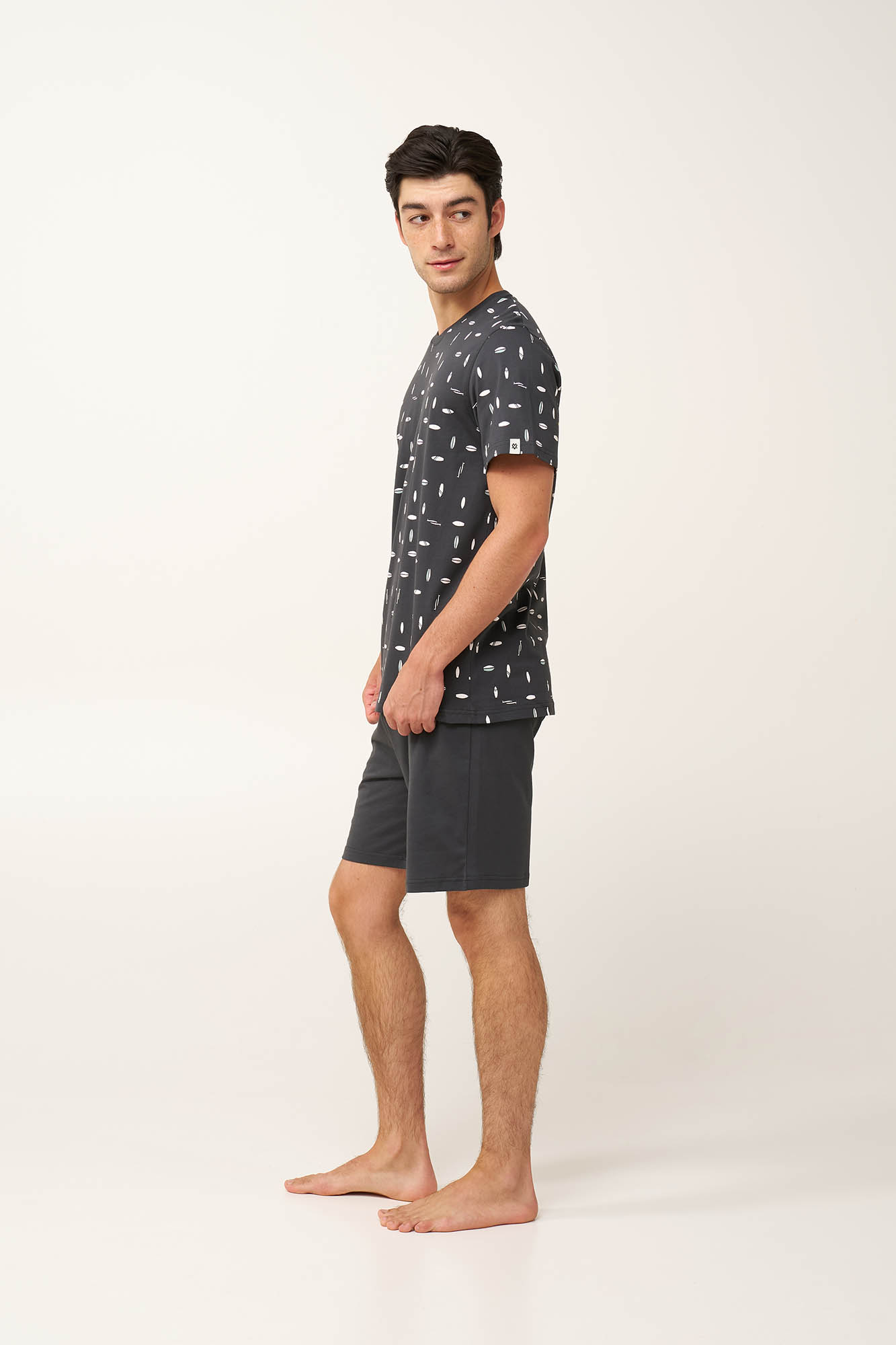 Επιλέξτε αυτό το ανδρικό σετ πυτζάμες, κατασκευασμένο από 100% βαμβάκι single jersey για δροσερή, ευχάριστη αίσθηση και φυσική διαπνοή. Η μπλούζα με στρογγυλή λαιμόκοψη φέρει τολμηρές, μινιμαλιστικές σιλουέτες από σανίδες surf, εμπνευσμένες από τη χαλαρή surf κουλτούρα. Συνδυάζεται με μονόχρωμο κοντό παντελόνι για καθαρό και ισορροπημένο σύνολο. Ιδανικό για ζεστά βράδια και στιγμές χαλάρωσης, με νεανική διάθεση.