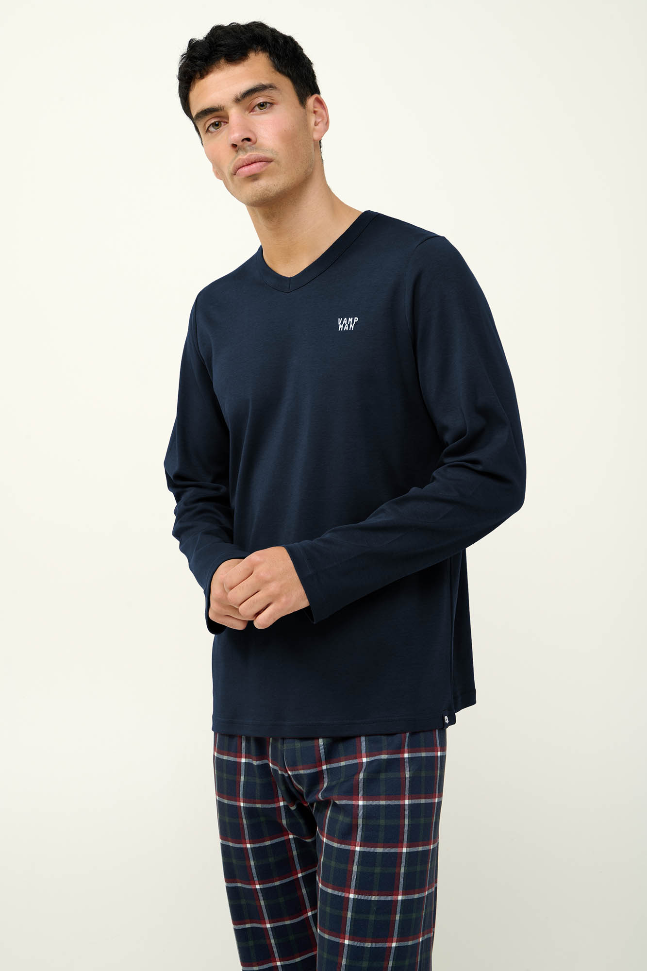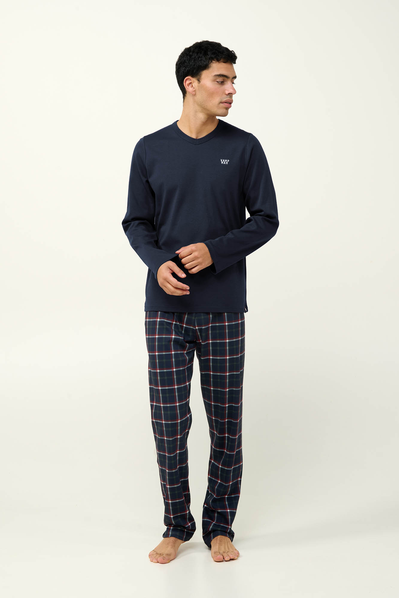 Χαρίστε διαχρονικό στυλ και γοητεία στα βράδια του χειμώνα, επιλέγοντας αυτές τις ανδρικές πυτζάμες από 100% απαλό και διαπνέον βαμβάκι interlock. Το μονόχρωμο μακρυμάνικο τοπ με κλασική V λαιμόκοψη, συνδυάζεται αρμονικά με ένα κλασικό καρό παντελόνι που ενισχύει τον διαχρονικό τους χαρακτήρα. Ένα σετ που θα σας προσφέρει άνεση και ελευθερία κινήσεων, αυτό το για να απολαύσετε κάθε στιγμή της ημέρας.