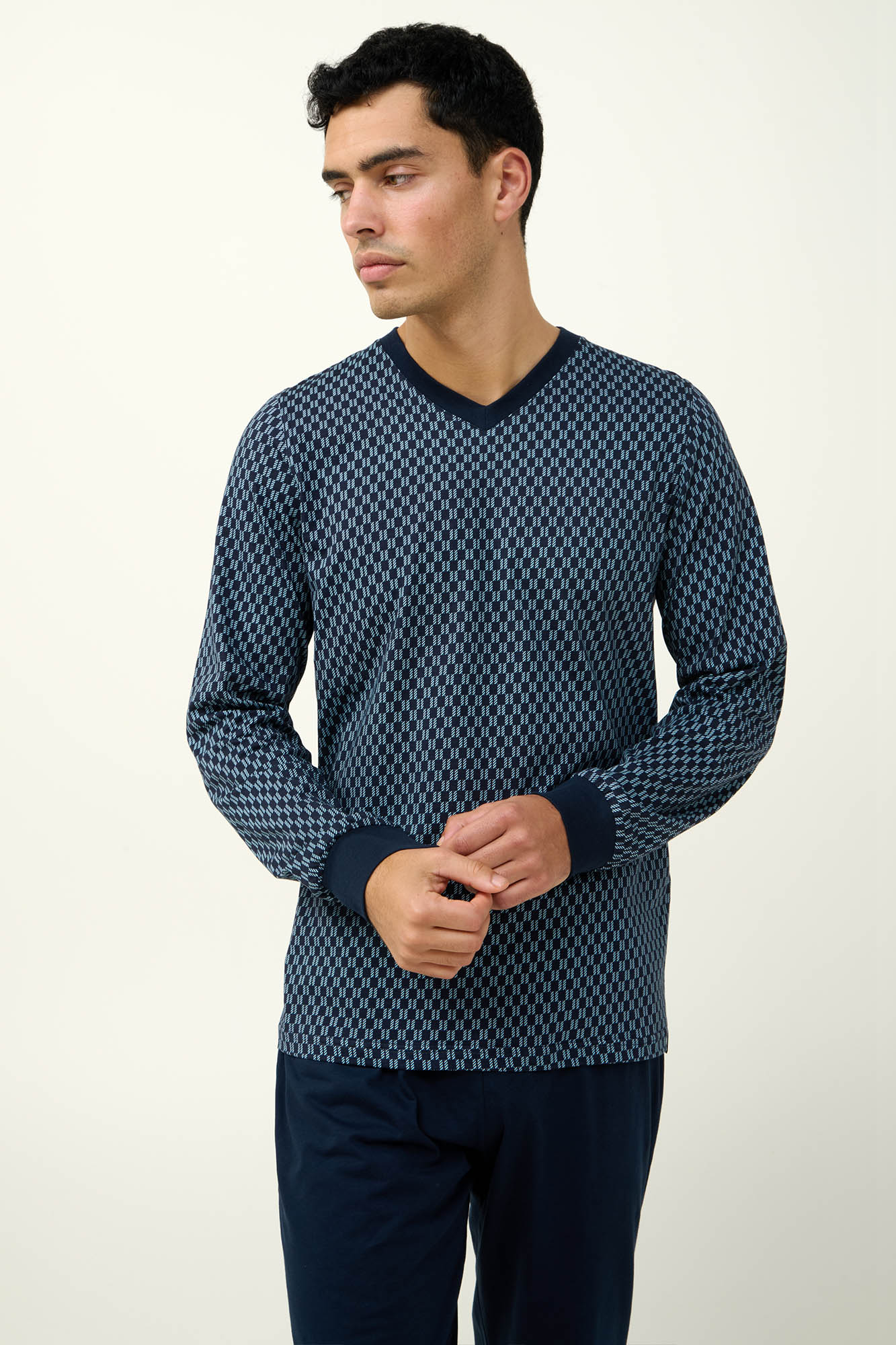 Προσθέστε στη συλλογή σας ένα σε χειμερινές ανδρικές πυτζάμες από 100% βαμβάκι s. jersey. Αποτελείται από μπλούζα σε κλασικό γεωμετρικό μοτίβο, με V λαιμόκοψη και μακριά μανίκια με μανσέτες. Το σετ συμπληρώνει ένα μονόχρωμο παντελόνι που προσφέρει ισορροπία και διαχρονικότητα στο σύνολο. Με απαλή, διαπνέουσα υφή και χαλαρή εφαρμογή, αυτό το σετ συνδυάζει άνεση και κομψότητα για τις στιγμές χαλάρωσης σας.