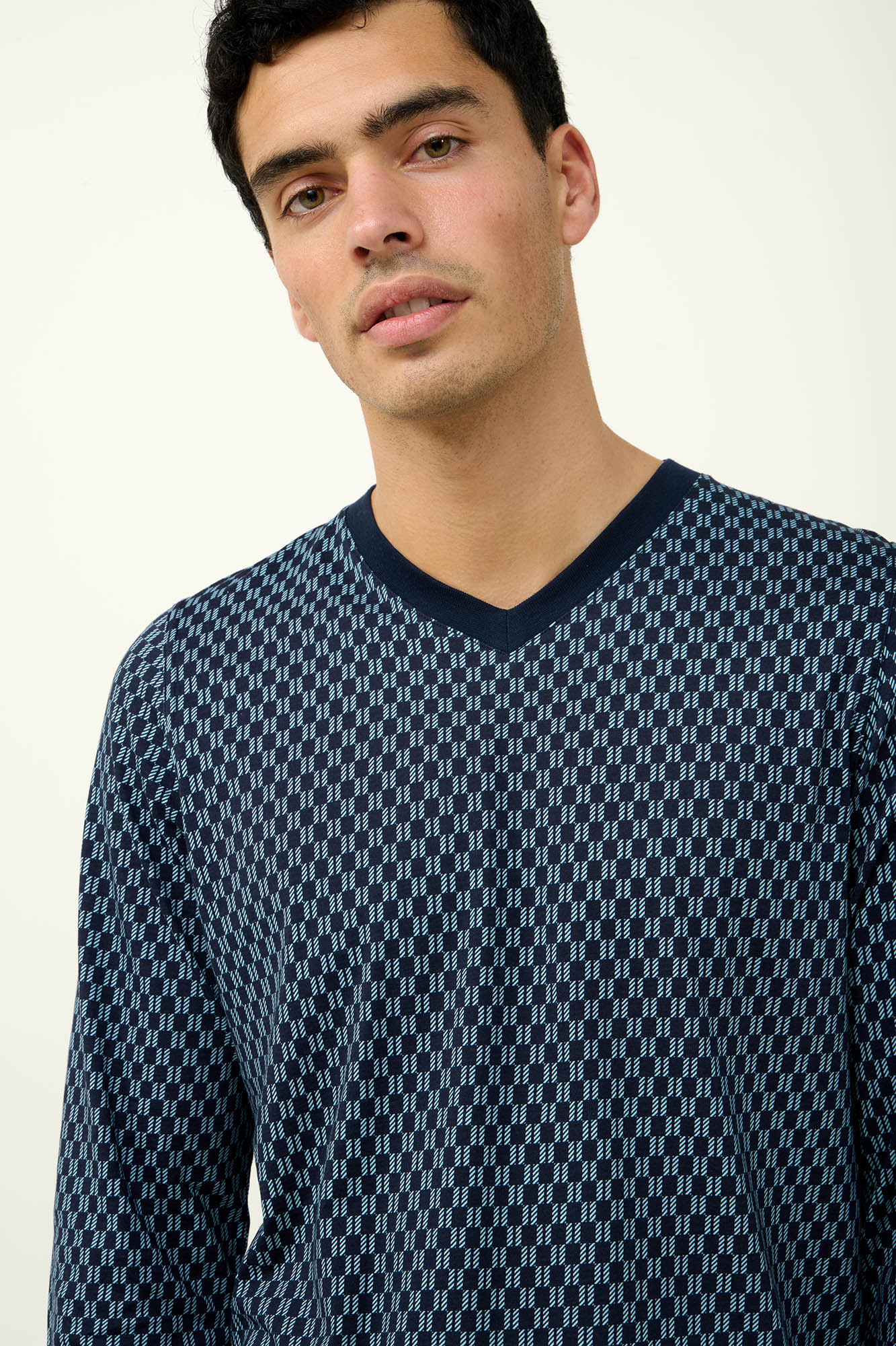 Προσθέστε στη συλλογή σας ένα σε χειμερινές ανδρικές πυτζάμες από 100% βαμβάκι s. jersey. Αποτελείται από μπλούζα σε κλασικό γεωμετρικό μοτίβο, με V λαιμόκοψη και μακριά μανίκια με μανσέτες. Το σετ συμπληρώνει ένα μονόχρωμο παντελόνι που προσφέρει ισορροπία και διαχρονικότητα στο σύνολο. Με απαλή, διαπνέουσα υφή και χαλαρή εφαρμογή, αυτό το σετ συνδυάζει άνεση και κομψότητα για τις στιγμές χαλάρωσης σας.