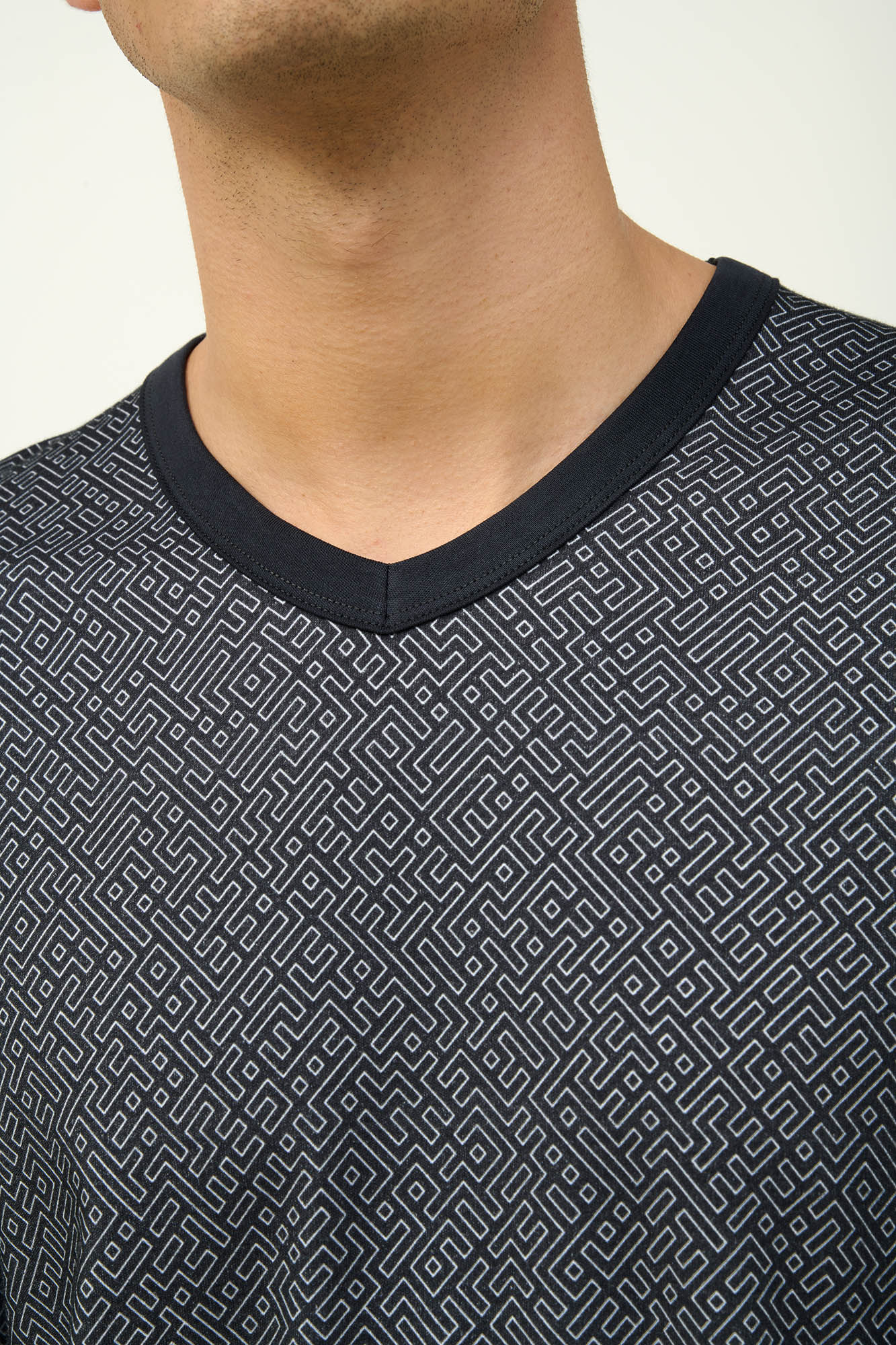 Προσθέστε στη γκαρνταρόμπα σας αυτές τις ανδρικές χειμερινές πυτζάμες από 100% βαμβάκι interlock, που προσφέρουν απαλή αίσθηση και άνετη εφαρμογή. Το πάνω μέρος έχει διακριτική V λαιμόκοψη και ξεχωρίζει χάρη στο μοντέρνο γεωμετρικό μοτίβο λαβυρίνθου. Συνδυάζεται με ένα μονόχρωμο παντελόνι με άνετη εφαρμογή που χαρίζει ισορροπία στο σύνολο. Ένα ιδανικό σετ για να απολαύσετε μοναδικές στιγμές χαλάρωσης.