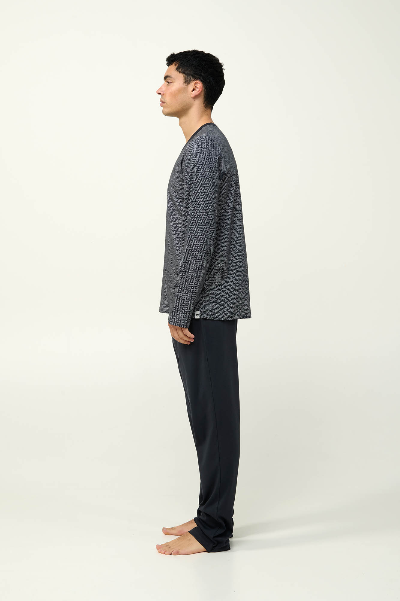 Προσθέστε στη γκαρνταρόμπα σας αυτές τις ανδρικές χειμερινές πυτζάμες από 100% βαμβάκι interlock, που προσφέρουν απαλή αίσθηση και άνετη εφαρμογή. Το πάνω μέρος έχει διακριτική V λαιμόκοψη και ξεχωρίζει χάρη στο μοντέρνο γεωμετρικό μοτίβο λαβυρίνθου. Συνδυάζεται με ένα μονόχρωμο παντελόνι με άνετη εφαρμογή που χαρίζει ισορροπία στο σύνολο. Ένα ιδανικό σετ για να απολαύσετε μοναδικές στιγμές χαλάρωσης.