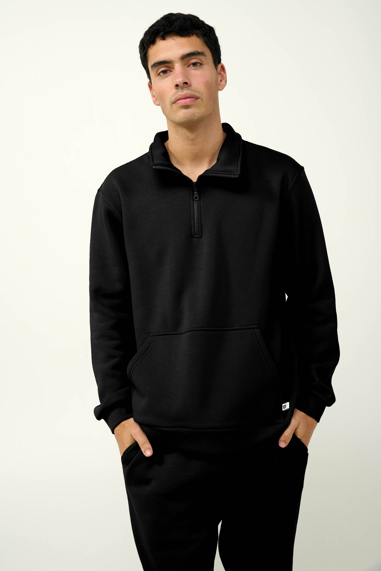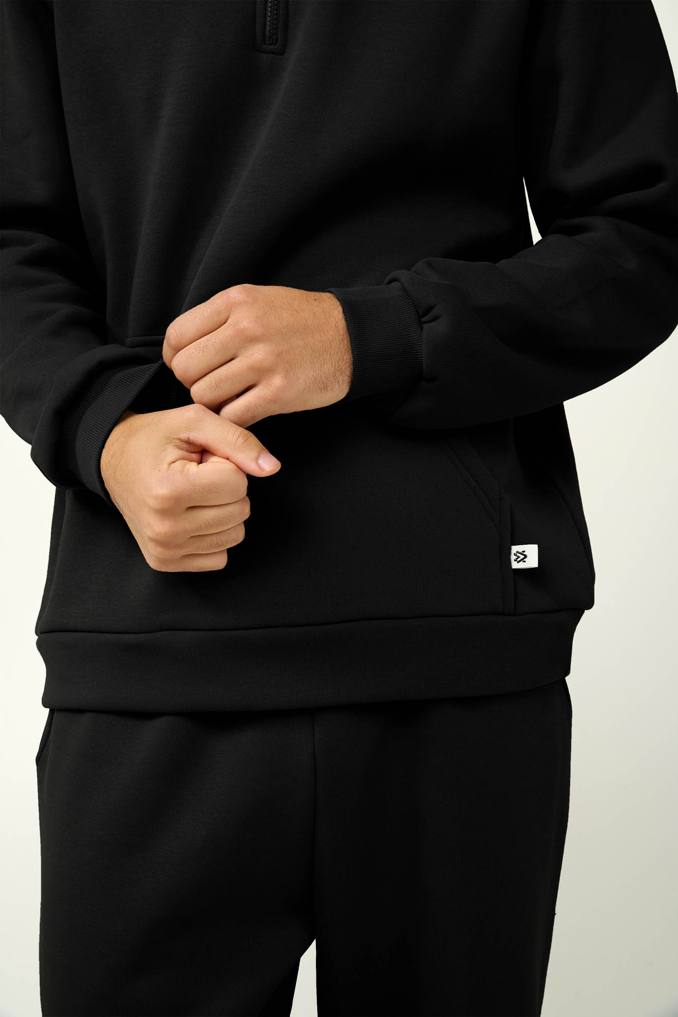 Αυτή η ανδρική χειμερινή φόρμα συνδυάζει ζεστή αίσθηση με χαλαρό στυλ. Κατασκευασμένη από απαλό φούτερ ύφασμα, διαθέτει φερμουάρ στη λαιμόκοψη και μανίκια με μανσέτες για άνετη εφαρμογή και ελευθερία κινήσεων. Η μπροστινή τσέπη-καγκουρό προσθέτει πρακτικότητα, κάνοντας την μια ιδανική επιλογή για χαλαρές στιγμές στο σπίτι ή casual εμφανίσεις τις κρύες μέρες του χειμώνα.