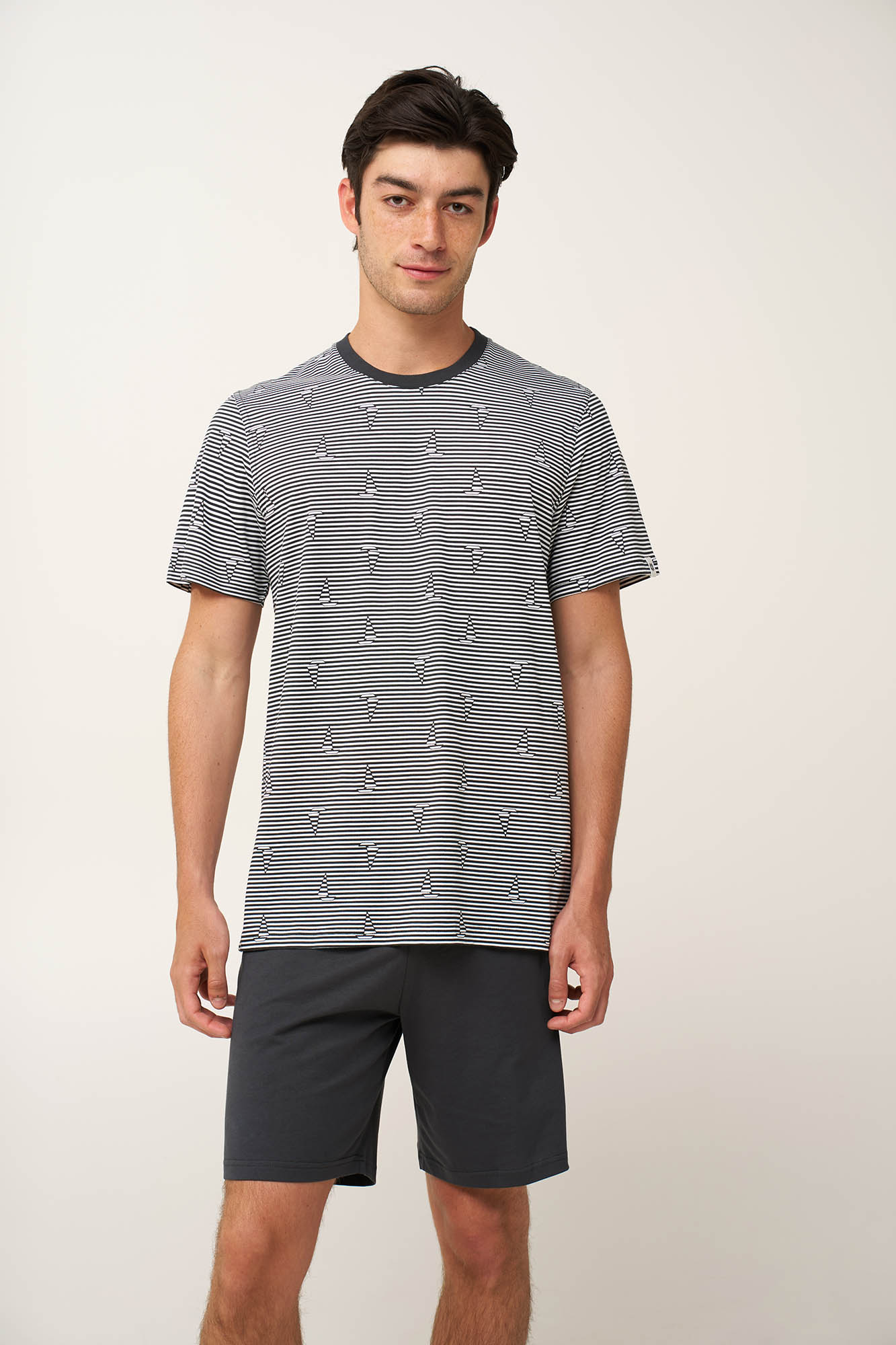Παραμείνετε άνετος και δροσερός με ένα σετ καλοκαιρινές ανδρικές πυτζάμες με στρογγυλή λαιμόκοψη και κλασικές ρίγες που διακόπτονται από γραφικά καραβάκια. Το σετ συμπληρώνει ένα μονόχρωμο κοντό παντελόνι με πίσω τσέπη. Είναι κατασκευασμένο από 100% απαλό βαμβάκι single jersey που επιτρέπει στο δέρμα να αναπνέει για να απολαύσετε κάθε ένα χαλαρό σαββατοκύριακο στο σπίτι ή ένα απόγευμα στο σπίτι μετά από μια μεγάλη ημέρα.