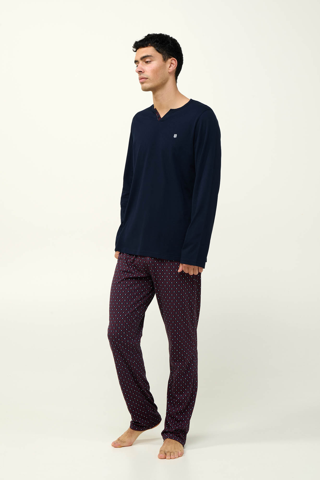 Ανανεώστε τηn γκαρνταρόμπα σας με αυτό το κλασικό σετ ανδρικές πυτζάμες από 100% βαμβάκι s. jersey που προσφέρει άνετη εφαρμογή και απαλή υφή, ιδανική για χαλάρωση ή ύπνο. Το μονόχρωμο πάνω μέρος συνδυάζεται αρμονικά με ένα παντελόνι που φέρει επαναλαμβανόμενο γεωμετρικό μοτίβο, δημιουργώντας ένα ισορροπημένο και διαχρονικό σύνολο. Ένα σετ σχεδιασμένο για να απολαύστε ένα όμορφο απόγευμα στο καναπέ ή ένα χαλαρό πρωινό.