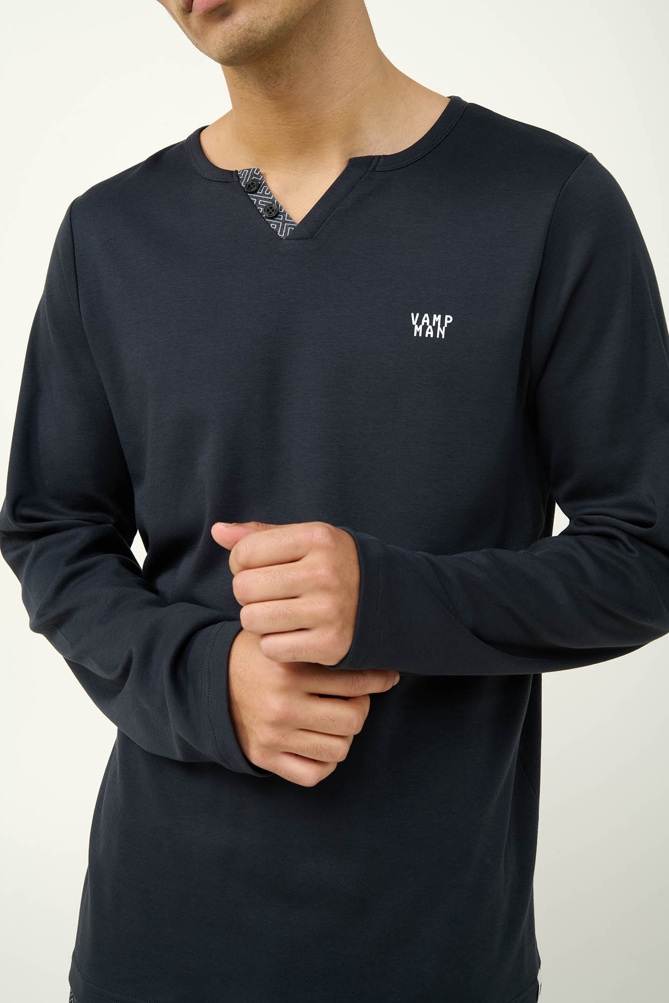 Δώστε άνεση στις στιγμές χαλάρωσης σας με αυτές τις ανδρικές πυτζάμες, κατασκευασμένες από 100% βαμβάκι interlock με απαλή υφή και διαπνοή. Το μονόχρωμο πάνω μέρος με διακριτική V λαιμόκοψη χαρίζει απλότητα στο σύνολο, ενώ το παντελόνι με το εντυπωσιακό γεωμετρικό μοτίβο λαβυρίνθου προσθέτει μια μοντέρνα νότα. Ένα σετ για να απολαύσετε τον βραδινό σας ύπνο ή ένα απόγευμα στο σπίτι.