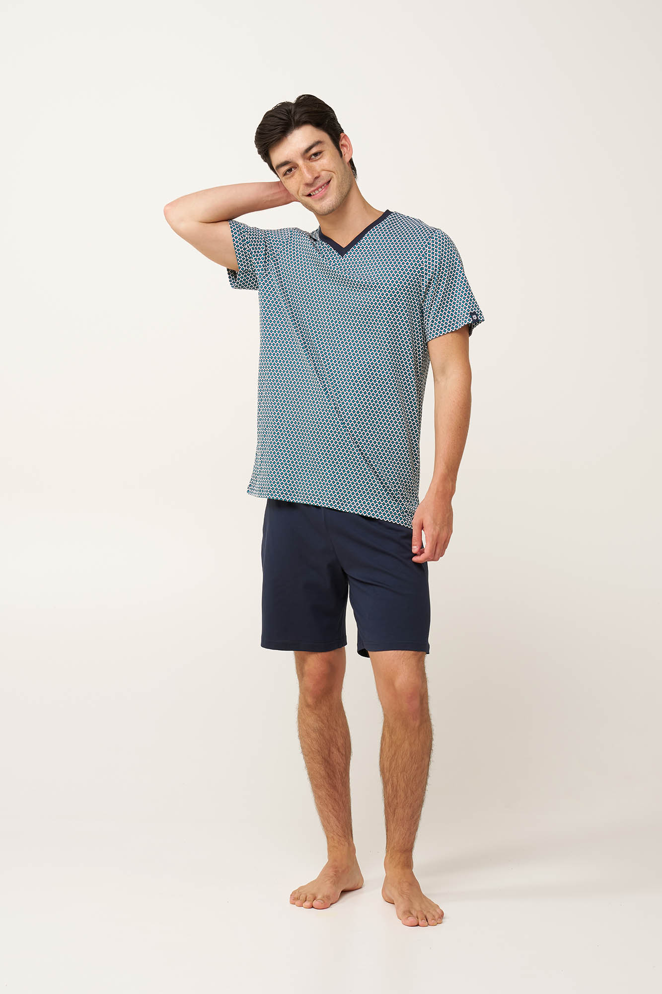 Ανανεώστε τα καλοκαιρινά σας βράδια με αυτό το ανδρικό σετ πυτζάμες, κατασκευασμένο από 100% βαμβάκι single jersey με απαλή και δροσερή αίσθηση στο δέρμα. Αποτελείται από τοπ με V λαιμόκοψη και ρυθμικό γεωμετρικό τύπωμα σε μπλε τόνους, που συνοδεύεται από ένα μονόχρωμο κοντό παντελόνι. Ελαφρύ και άνετο, είναι ιδανικό για στιγμές χαλάρωσης ή για ξεκούραστο ύπνο τα ζεστά βράδια του καλοκαιριού.