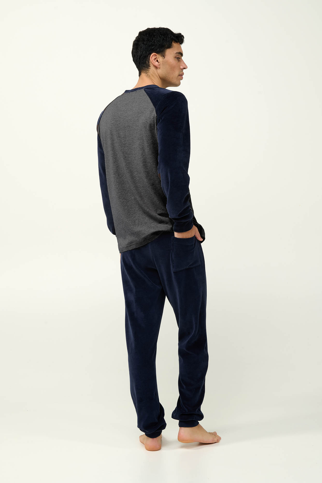 Προσθέστε στην γκαρνταρόμπα σας ένα σετ ανδρικές πυτζάμες που αποτελείτε από μονόχρωμο παντελόνι με μανσέτες και δίχρωμο τοπ με στρογγλυή λαιμόκοψη και μανσέτες στα μανίκια. Κατασκευασμένο από πλούσιο σε βαμβάκι βελούδο θα σας κρατήσει ζεστούς προσφέροντας απαλή αίσθηση στο σώμα. Ένας όμορφος συνδυασμός κομψότητας και άνεσης που θα εκτιμήσετε τους πιο κρύους μήνες.