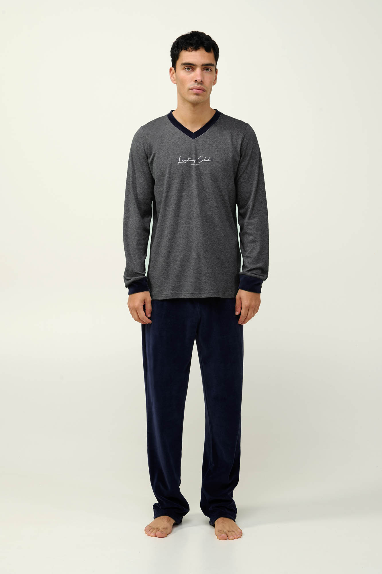 Ενδώστε στην άνεση και την υπέροχη αίσθηση που προσφέρουν αυτές οι χειμερινές ανδρικές πυτζάμες, κατασκευασμένες από πλούσιο σε βαμβάκι βελούδο. Το σετ αποτελείται από μπλούζα με λαιμόκοψη V και μανσέτες στα μανίκια, που συνοδεύεται από ένα άνετο μονόχρωμο παντελόνι. Ιδανικές για τις κρύες νύχτες και χαλαρά πρωινά στο σπίτι.