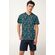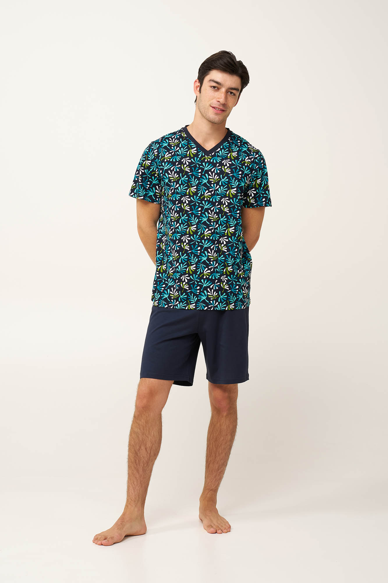 Επιλέξτε αυτό το σετ ανδρικές πυτζάμες, κατασκευασμένο από 100% βαμβάκι single jersey, για να δώσετε άνεση και φυσική διαπνοή στο σώμα σας τις πιο ζεστές ημέρες. Η μπλούζα είναι σχεδιασμένη με λαιμόκοψη V και ένα τροπικό μοτίβο από φύλλα σε λευκές και τιρκουάζ αποχρώσεις, ενώ το κοντό παντελόνι είναι μονόχρωμο με άνετη εφαρμογή. Απολαύστε ένα ήρεμο πρωινό στις διακοπές ή ένα χαλαρό απόγευμα μετά από μια μεγάλη ημέρα.