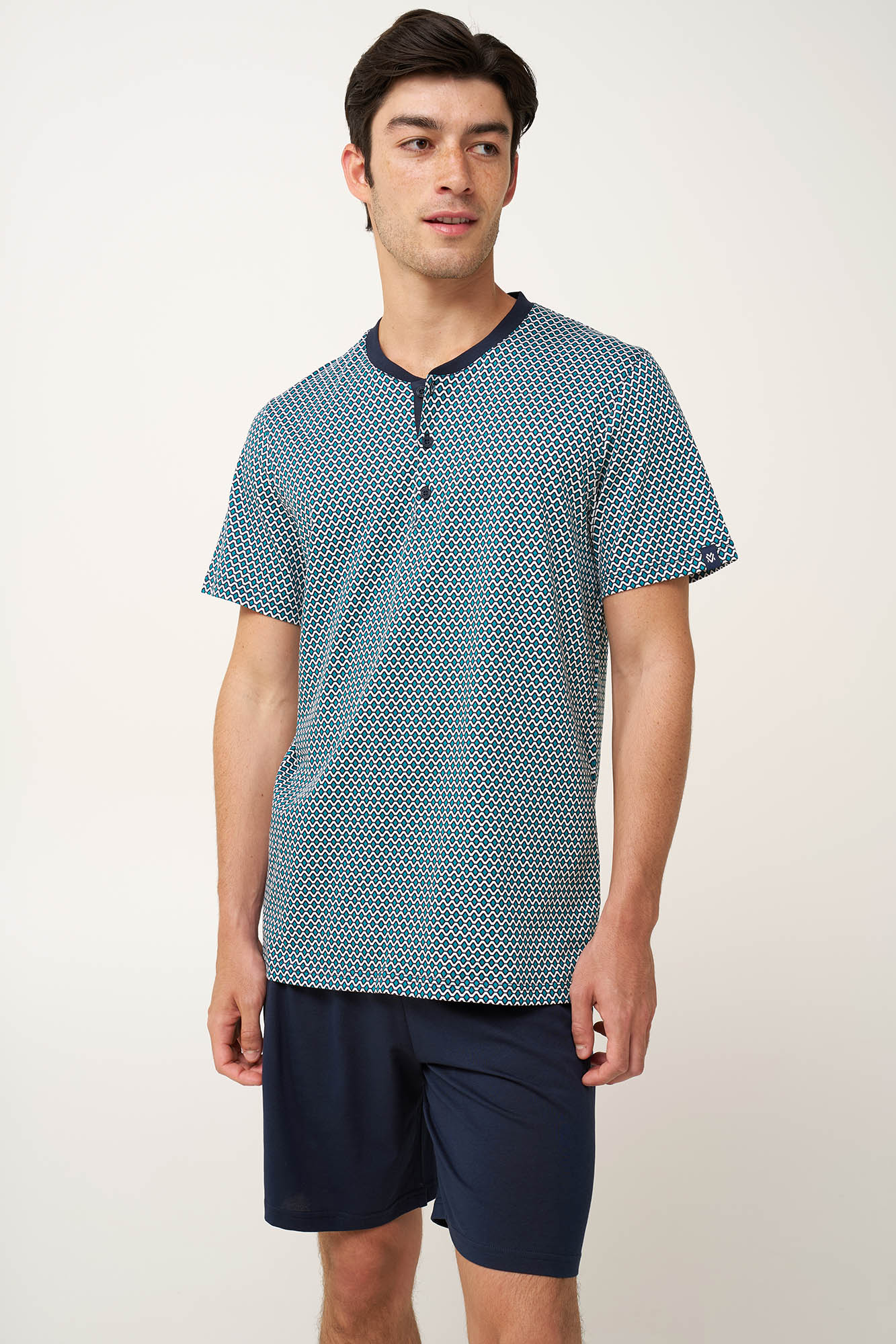 Προσθέστε στην γκαρνταρόμπα σας αυτό το πρακτικό ανδρικό σετ πυτζάμες τριών τεμαχίων, κατασκευασμένο από 100% βαμβάκι single jersey για απαλή, και διαπνέουσα αίσθηση. Αποτελείται από μπλούζα με κλασική πατιλέτα που είναι διακοσμημένη με ένα ρυθμικό γεωμετρικό τύπωμα σε ψυχρούς μπλε τόνους. Το σετ συμπληρώνουν ένα μονόχρωμο κοντό και ένα μακρύ παντελόνι. Φορέστε αυτό που σας εξυπηρετεί από τα ζεστά πρωινά ως τα δροσερά βράδια των διακοπών στη βεράντα.