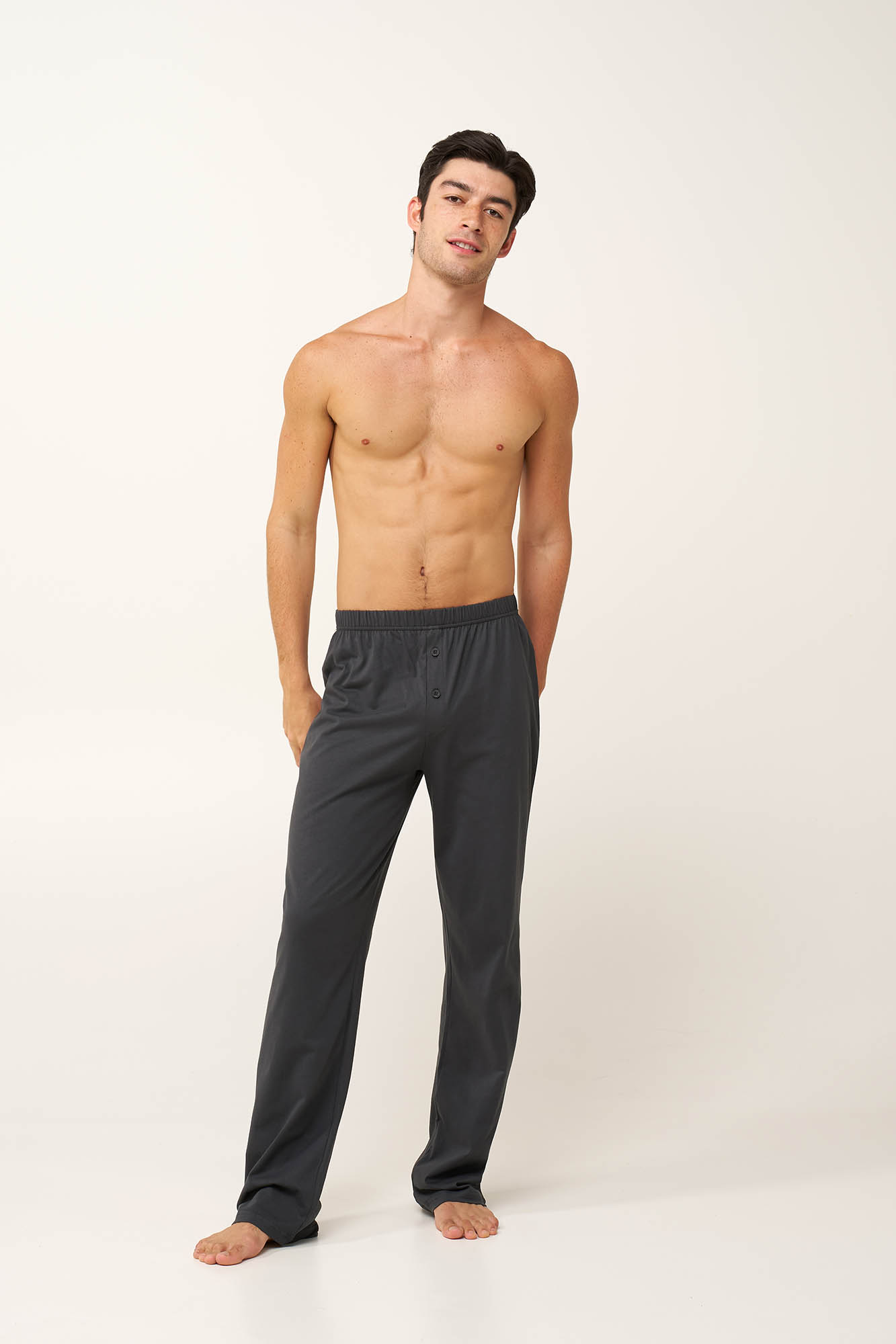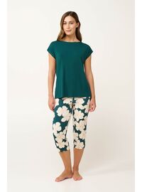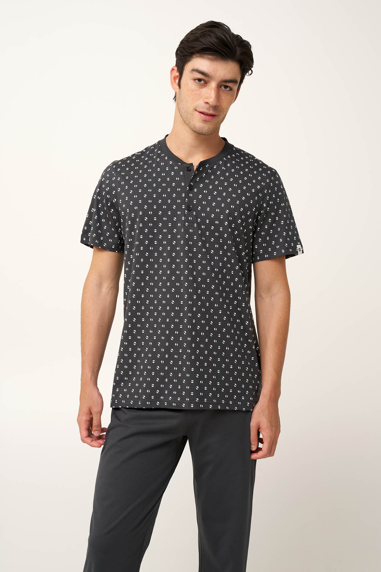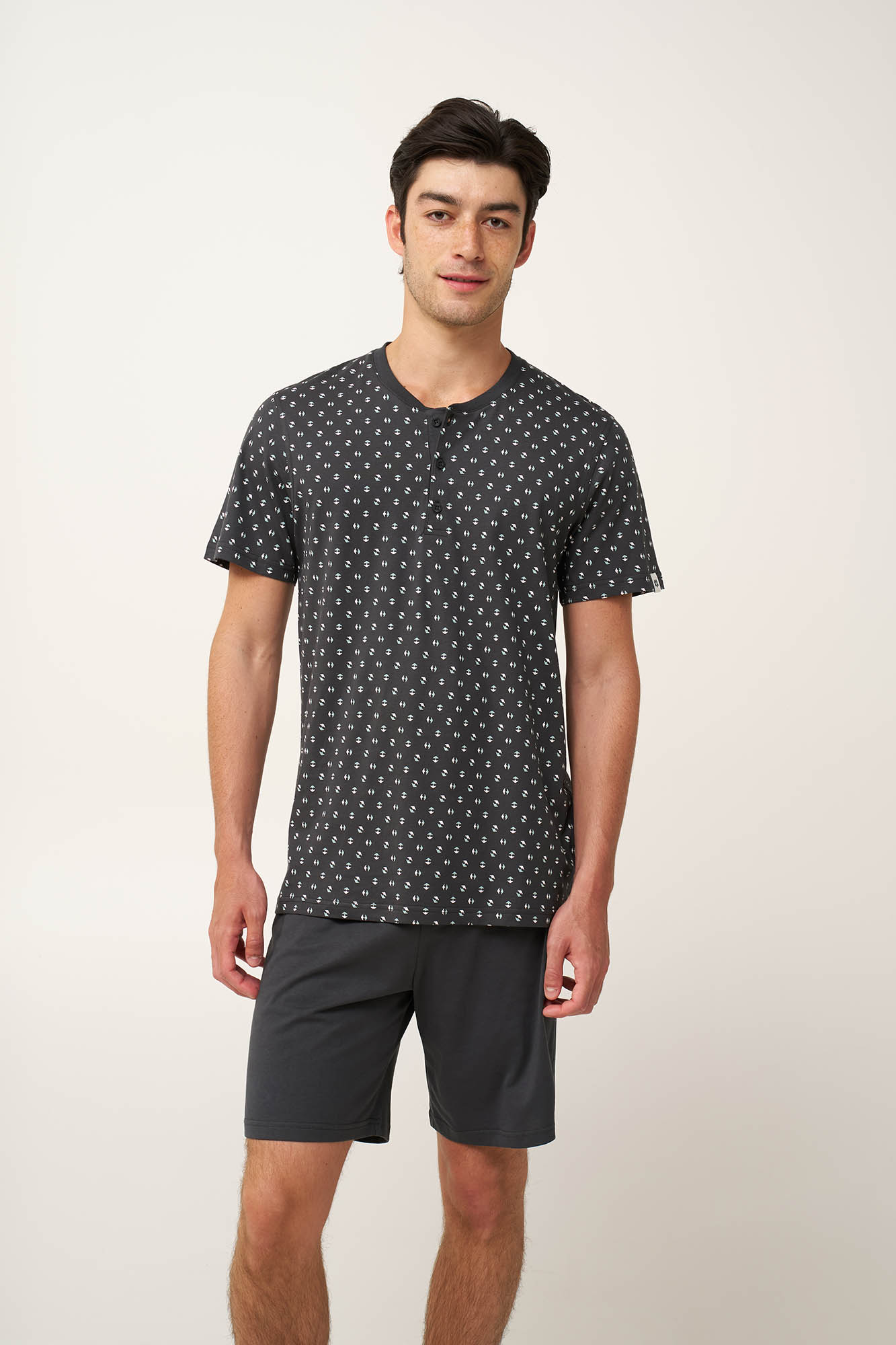 Προσθέστε στην γκαρνταρόμπα σας, αυτό το ανδρικό σετ πυτζάμας τριών τεμαχίων, που είναι κατασκευασμένο από 100% βαμβακερό single jersey με φυσική διαπνοή και απαλότητα. Αποτελείται από κοντομάνικο τοπ με πατιλέτα, που διαθέτει διακριτικό μοτίβο εμπνευσμένο από τη φύση, με μινιμαλιστικές πράσινες και λευκές φόρμες πάνω σε σκούρο φόντο. Συνδυάζεται με δύο μονόχρωμα παντελόνια, ένα κοντό και ένα μακρύ, προσφέροντας ευελιξία και χαλαρή κίνηση. Άνετο και πρακτικό είναι για να απολαύσετε τα δροσερά βράδια στη βεράντα και τον βραδινό σας ύπνο.