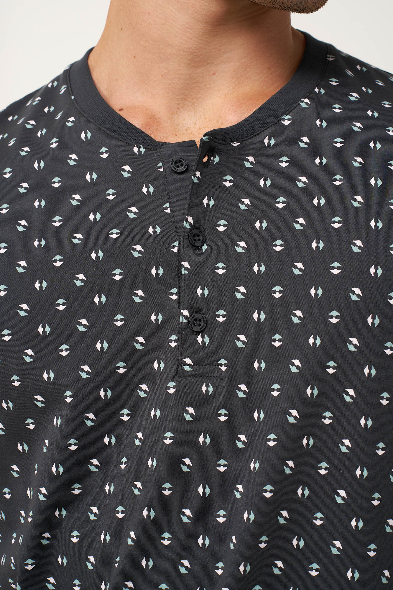 Προσθέστε στην γκαρνταρόμπα σας, αυτό το ανδρικό σετ πυτζάμας τριών τεμαχίων, που είναι κατασκευασμένο από 100% βαμβακερό single jersey με φυσική διαπνοή και απαλότητα. Αποτελείται από κοντομάνικο τοπ με πατιλέτα, που διαθέτει διακριτικό μοτίβο εμπνευσμένο από τη φύση, με μινιμαλιστικές πράσινες και λευκές φόρμες πάνω σε σκούρο φόντο. Συνδυάζεται με δύο μονόχρωμα παντελόνια, ένα κοντό και ένα μακρύ, προσφέροντας ευελιξία και χαλαρή κίνηση. Άνετο και πρακτικό είναι για να απολαύσετε τα δροσερά βράδια στη βεράντα και τον βραδινό σας ύπνο.