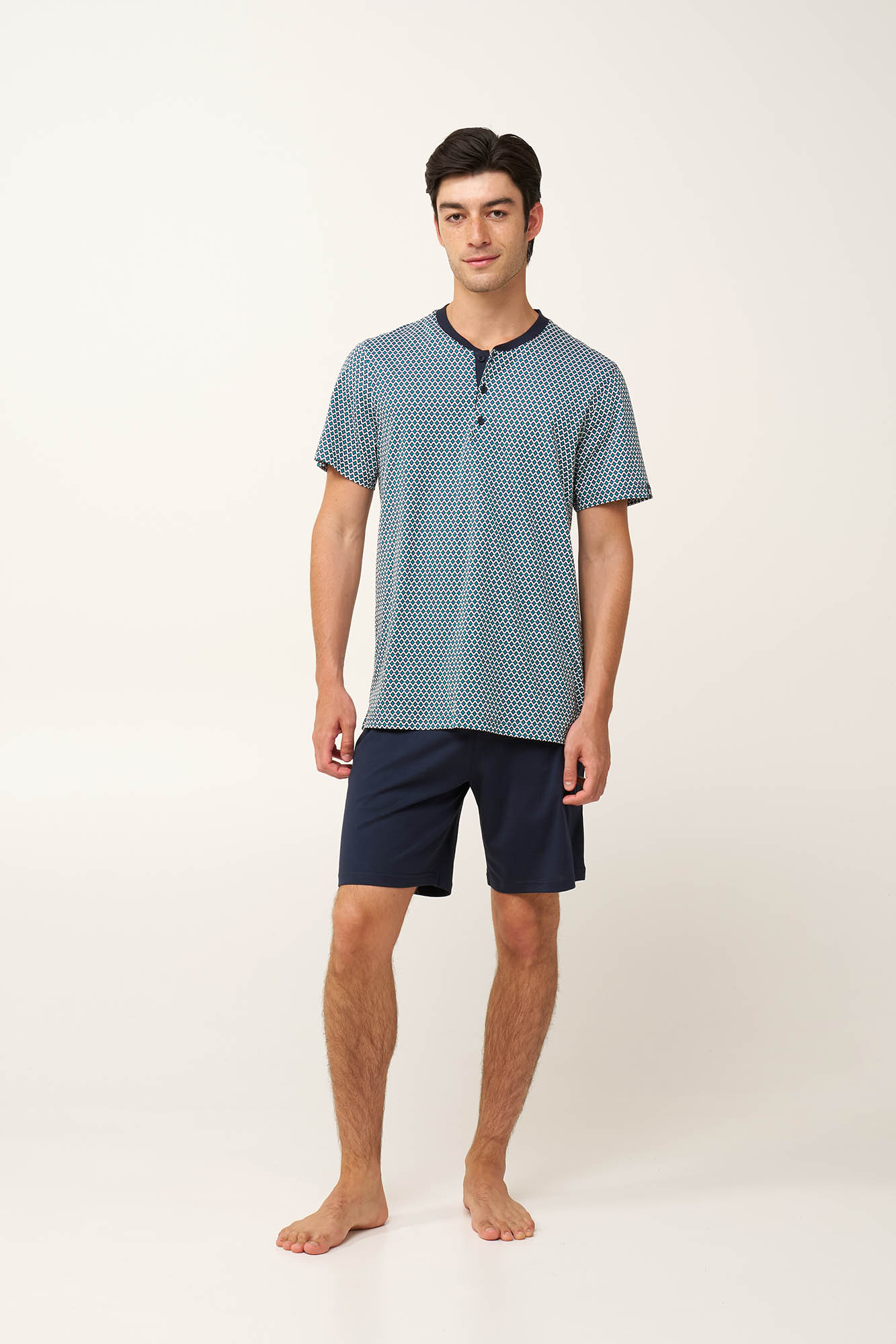 Προσθέστε στην γκαρνταρόμπα σας αυτό το ανδρικό σετ πυτζάμες, κατασκευασμένο από 100% βαμβάκι single jersey με απαλή, και διαπνέουσα αίσθηση στο σώμα. Το πάνω μέρος είναι σχεδιασμένο με κλασική πατιλέτα και είναι διακοσμημένο με ένα ρυθμικό γεωμετρικό τύπωμα σε ψυχρούς μπλε τόνους. Το σετ συμπληρώνει ένα με μονόχρωμο κοντό παντελόνι. Ιδανικό για στιγμές ξεκούρασης μετά από μια μεγάλη ημέρα ή τις καλοκαιρινές διακοπές.