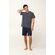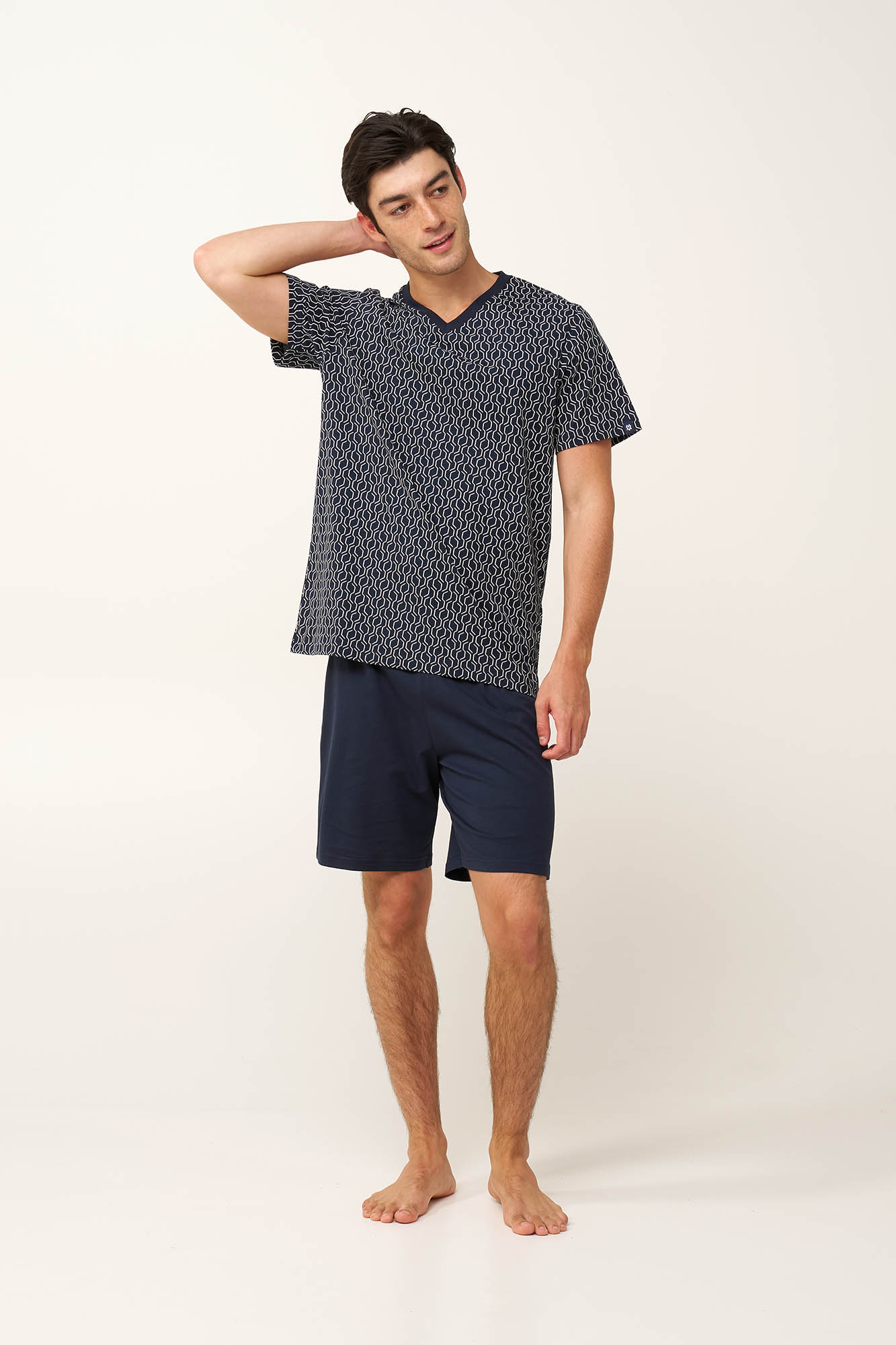 Ανανεώστε τη συλλογή σας με αυτό το ανδρικό σετ πυτζάμες, σχεδιασμένο για απόλυτη άνεση. Κατασκευασμένο από απαλό και διαπνέον 100% βαμβάκι single jersey, προσφέρει ελαφριά και ευχάριστη αίσθηση στο δέρμα. Αποτελείται από κοντομάνικο τοπ με λαιμόκοψη V που διακοσμείται με ένα γεωμετρικό μοτίβο κυμάτων και ένα μονόχρωμο κοντό παντελόνι που χαρίζει ισορροπία στο σύνολο. Άνετο και διαχρονικό, είναι ιδανικό για ζεστές νύχτες ή χαλαρές στιγμές στο σπίτι.