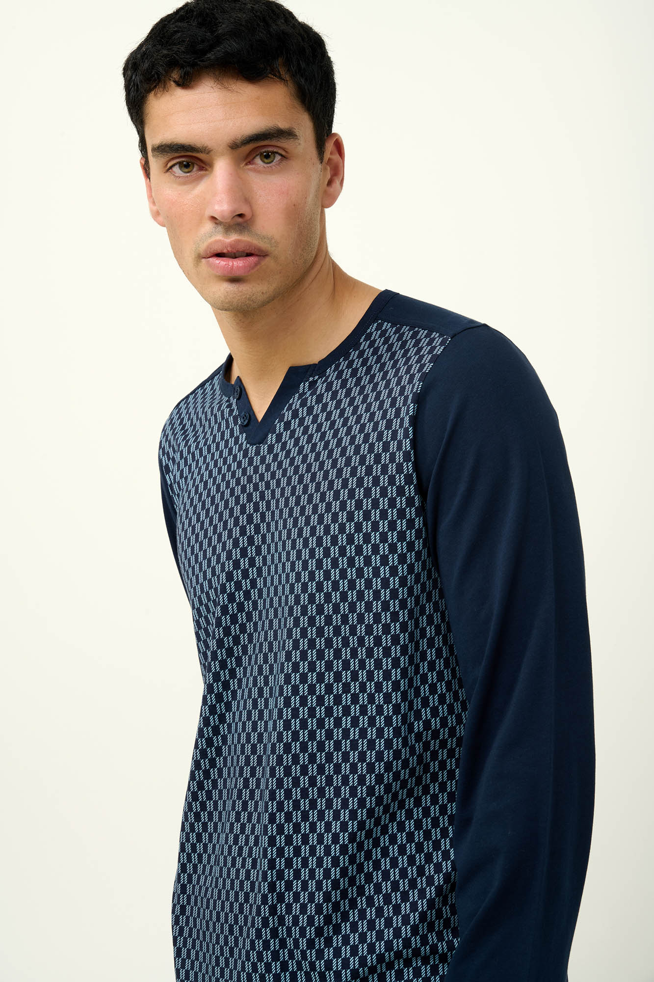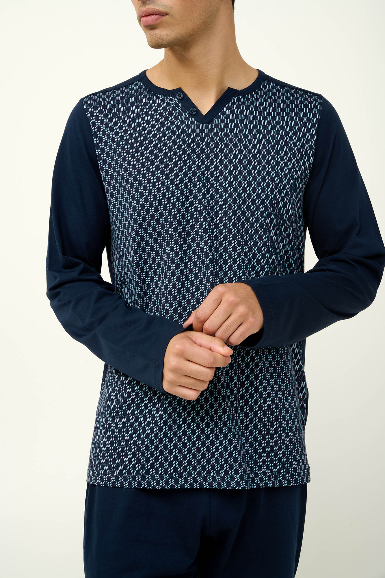 Δώστε άνεση στα βράδια του χειμώνα με αυτές τις ανδρικές πυτζάμες από 100% βαμβάκι s. jersey. Αποτελείται από τοπ με κλασικό γεωμετρικό μοτίβο, διακριτική V λαιμόκοψη και μονόχρωμα μανίκια. Το σετ συμπληρώνει ένα άνετο μονόχρωμο παντελόνι που χαρίζει αρμονία στο σύνολο. Ένα σετ με εξαιρετική διαπνοή και απαλή αίσθηση που θα απολαύσετε κάθε στιγμή.