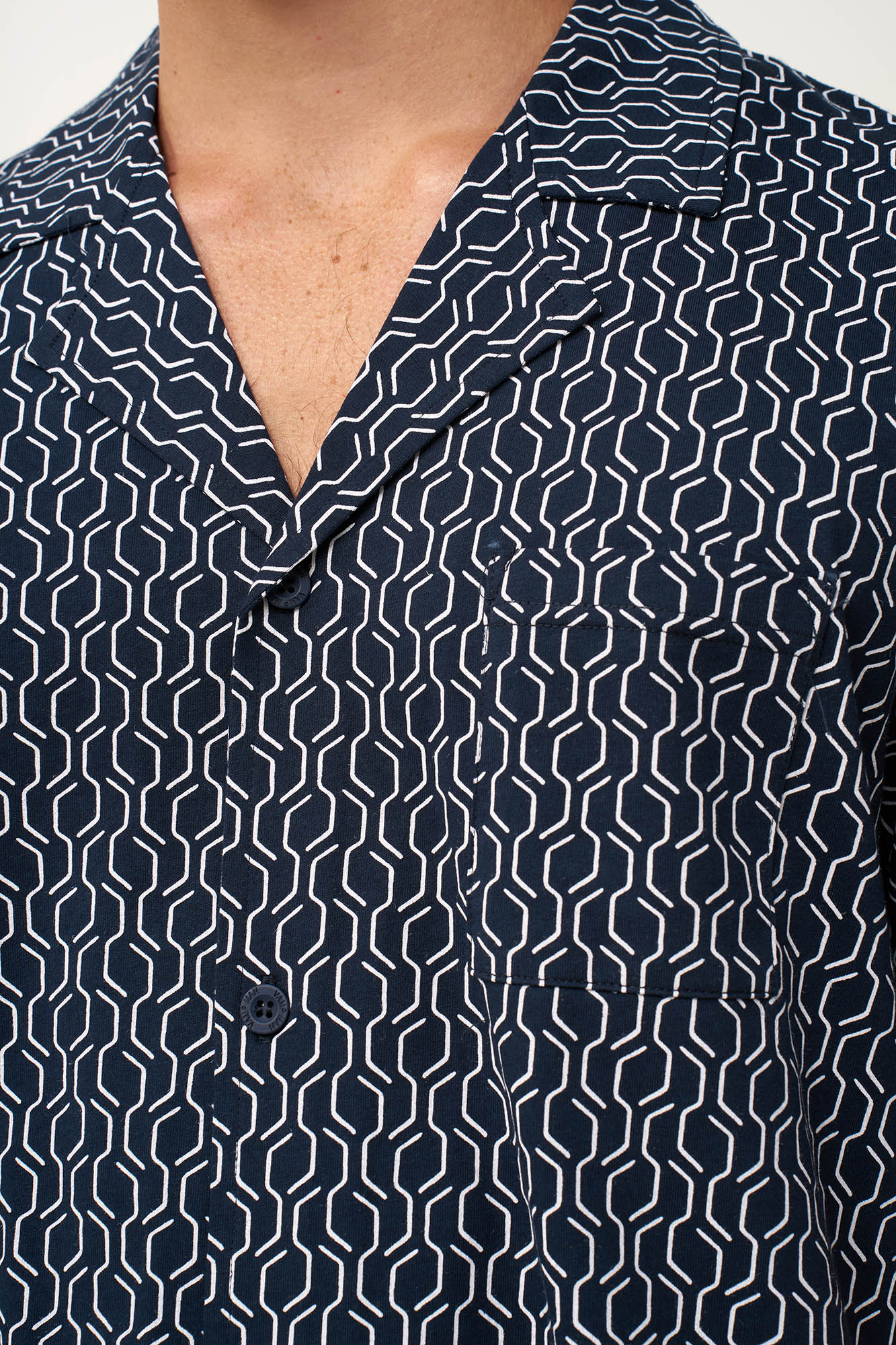 Απολαύστε χαλαρά καλοκαιρινά βράδια με αυτό το ανδρικό σετ πυτζάμες, κατασκευασμένο από απαλό και δροσερό 100% βαμβάκι single jersey που χαρίζει ευχάριστη αίσθηση στο δέρμα. Αποτελείται από κουμπωτό πάνω μέρος με γεωμετρικό μοτίβο κυμάτων, που προσφέρει μια μοντέρνα πινελιά στο κλασικό, διαχρονικό ύφος, ενώ ένα μονόχρωμο μακρύ παντελόνι εξασφαλίζει άνεση. Ιδανικό για στιγμές χαλάρωσης ή δροσερά βράδια στη βεράντα.