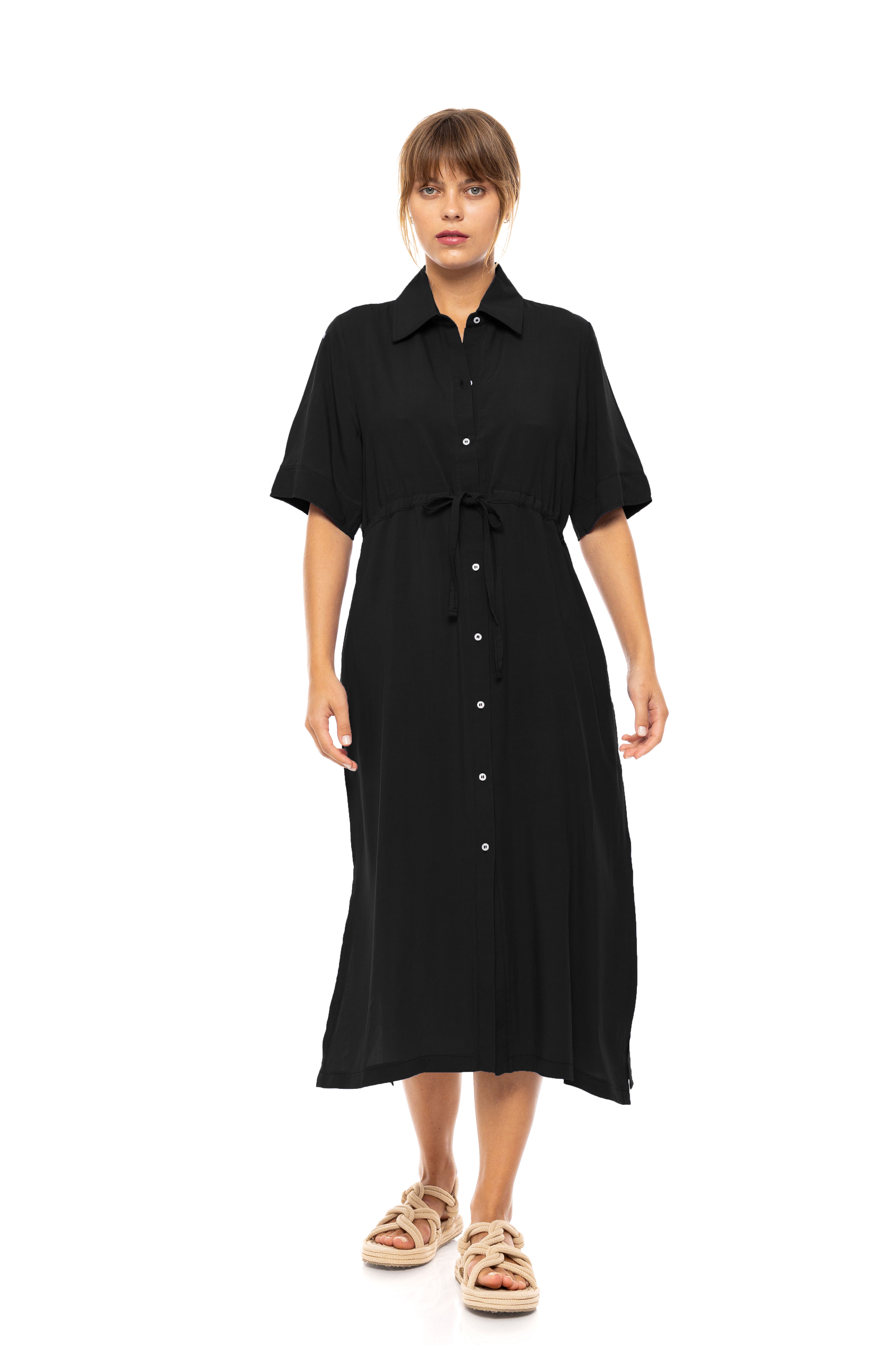 Γυναικείο Beachdress Pink Label σε άνετη γραμμή. Σεμιζιέ φόρεμα παραλίας μαύρο με γιακά και άνοιγμα V στο στήθος, 100 % Viscose
