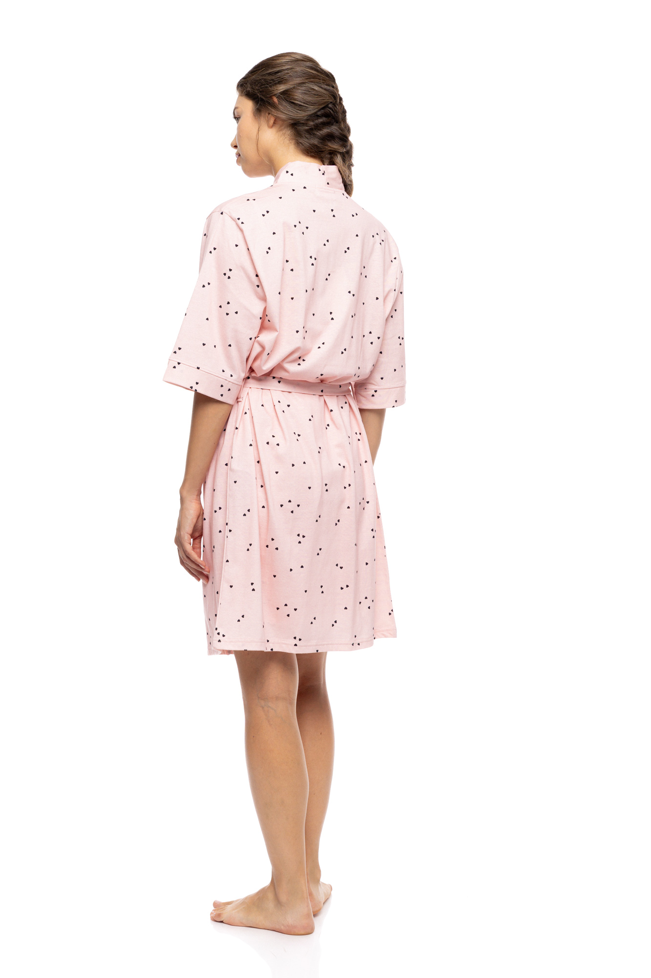 Κομψή βαμβακερή σταυρωτή ρόμπα με σχέδιο σε ρόζ χρώμα με μαύρες καρδιές. Νεανική και μοντέρνα επιλογή για να συνοδέψει το σύνολο σπιτιού σας.