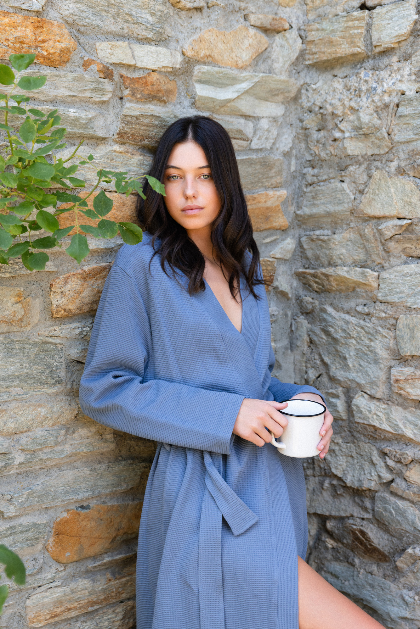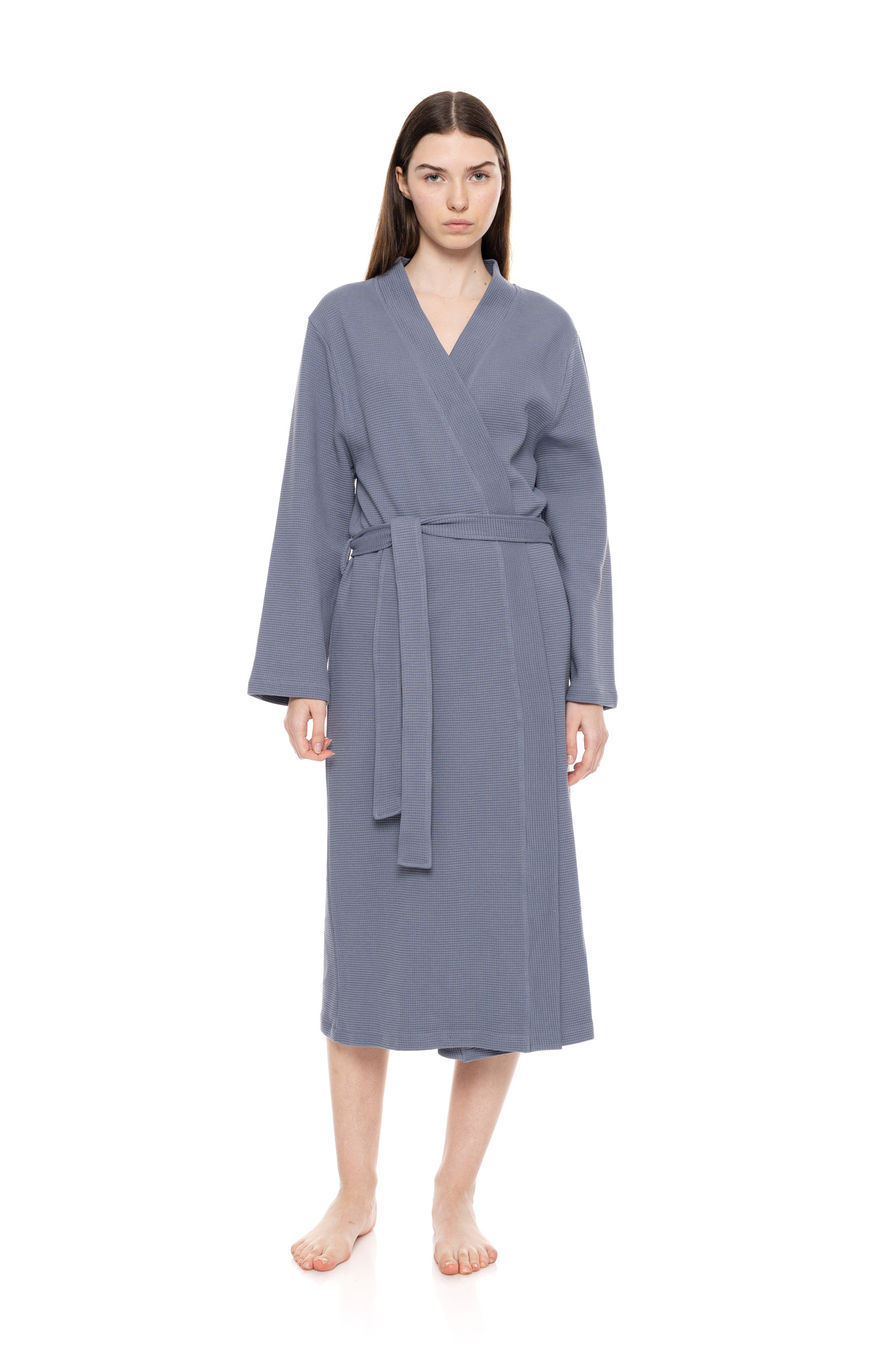 Γυναικεία Ρόμπα με μακρύ μανίκι Pink Label. Νεανική Ρόμπα midi cosmos blue σε ίσια γραμμή κατασκευασμένη από βαμβακερό ύφασμα που επιτρέπει στο δέρμα να αναπνέει, ζώνη για δέσιμο στην μέση και τσέπες.