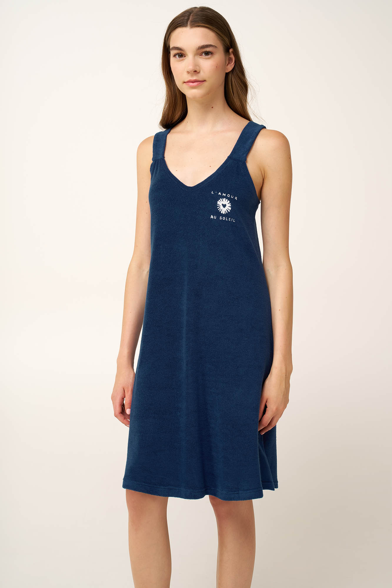 Απολαύστε τις ηλιόλουστες ημέρες με αυτό το καλοκαιρινό φόρεμα θαλάσσης από frottee ύφασμα με υψηλή περιεκτικότητα σε βαμβάκι, με απαλή και δροσερή αίσθηση που κινείται φυσικά με το σώμα. Σχεδιασμένο με τιράντες και λαιμόκοψη V, σας κρατά άνετες κάτω από τον ήλιο. Ιδανικό για χαλάρωση στην παραλία, στιγμές δίπλα στην πισίνα ή χαλαρές βόλτες στις διακοπές, συνδυάζει πρακτικότητα με κλασικό, καλοκαιρινό στυλ.
