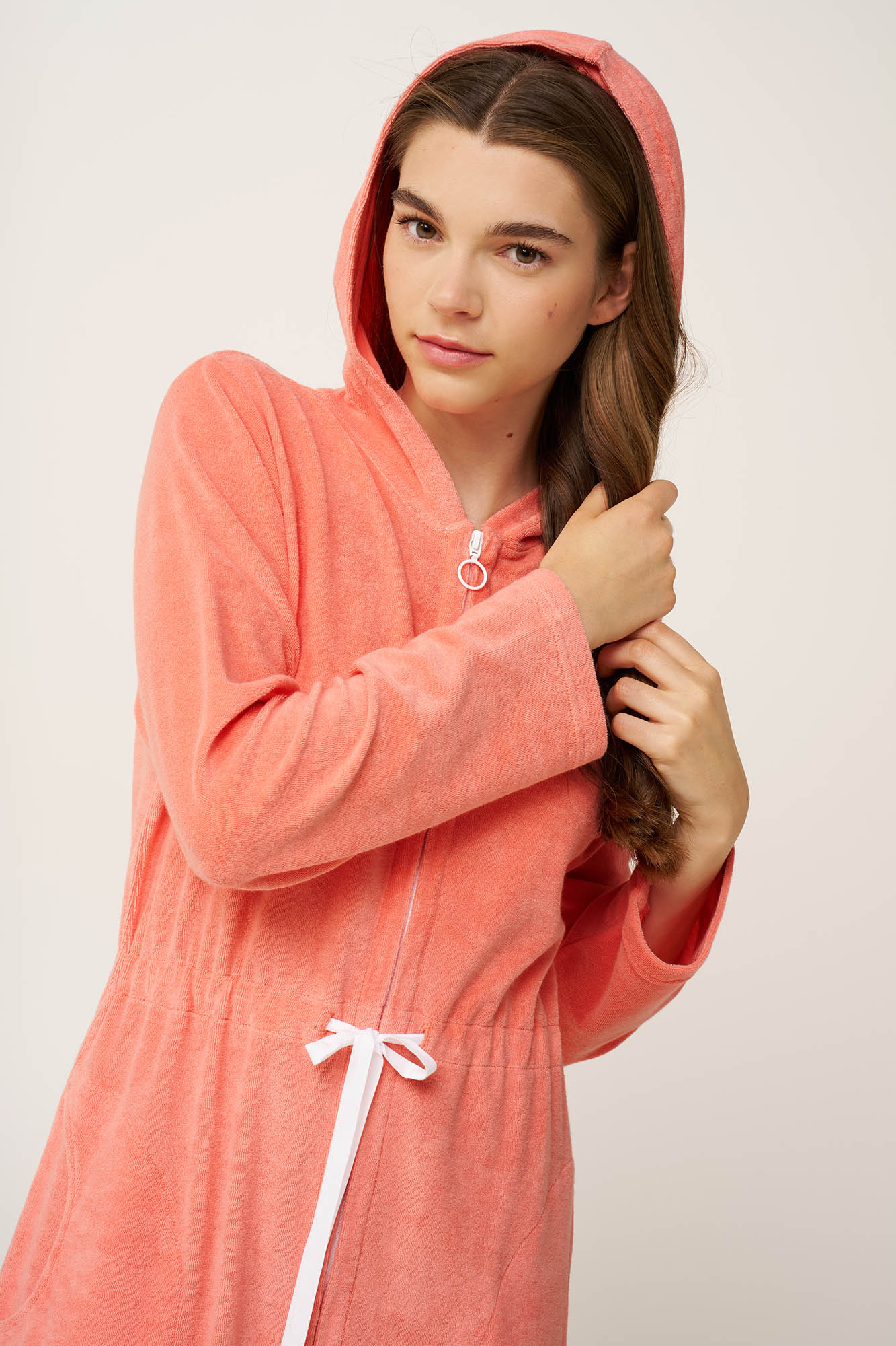 Προσθέστε στις αποσκευές σας ένα καλοκαιρινό φόρεμα από απαλό frottee ύφασμα με υψηλή περιεκτικότητα σε βαμβάκι. Σχεδιασμένο με κουκούλα και πρακτικές πλαϊνές τσέπες, κλείνει μπροστά με φερμουάρ και εφαρμογή που προσαρμόζετε στη μέση θα σας αγκαλιάσει με άνεση και απορροφητικότητα. Η φρέσκια του απόχρωση αποπνέει τη ζεστασιά του ήλιου και τα φρούτα της εποχής, ώστε να απολαύσετε κάθε σας στιγμή στη θάλασσα ή μια ήρεμη καλοκαιρινή βόλτα.