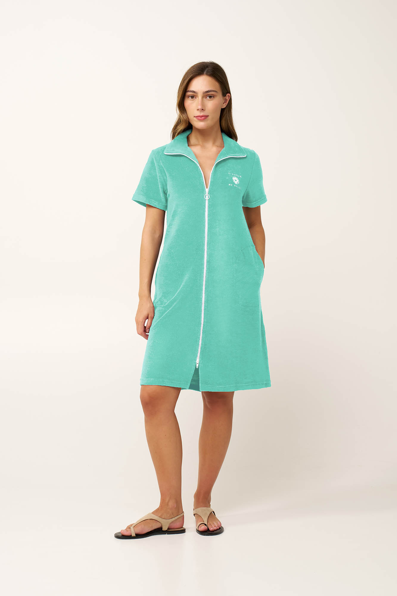 Απολαύστε τις ηλιόλουστες ημέρες με αυτό το καλοκαιρινό φόρεμα, σχεδιασμένο για απόλυτη άνεση. Κατασκευασμένο από δροσερό frottee ύφασμα με υψηλή περιεκτικότητα σε βαμβάκι, αγκαλιάζει απαλά το σώμα. Είναι σχεδιασμένο με κοντά μανίκια, γιακά, κλείνει εύκολα μπροστά με φερμουάρ και έχει πρακτικές πλαϊνές τσέπες. Ιδανικό μετά το μπάνιο ή για χαλαρές στιγμές δίπλα στη θάλασσα, αποτυπώνει τη γαλήνια απλότητα του καλοκαιριού.