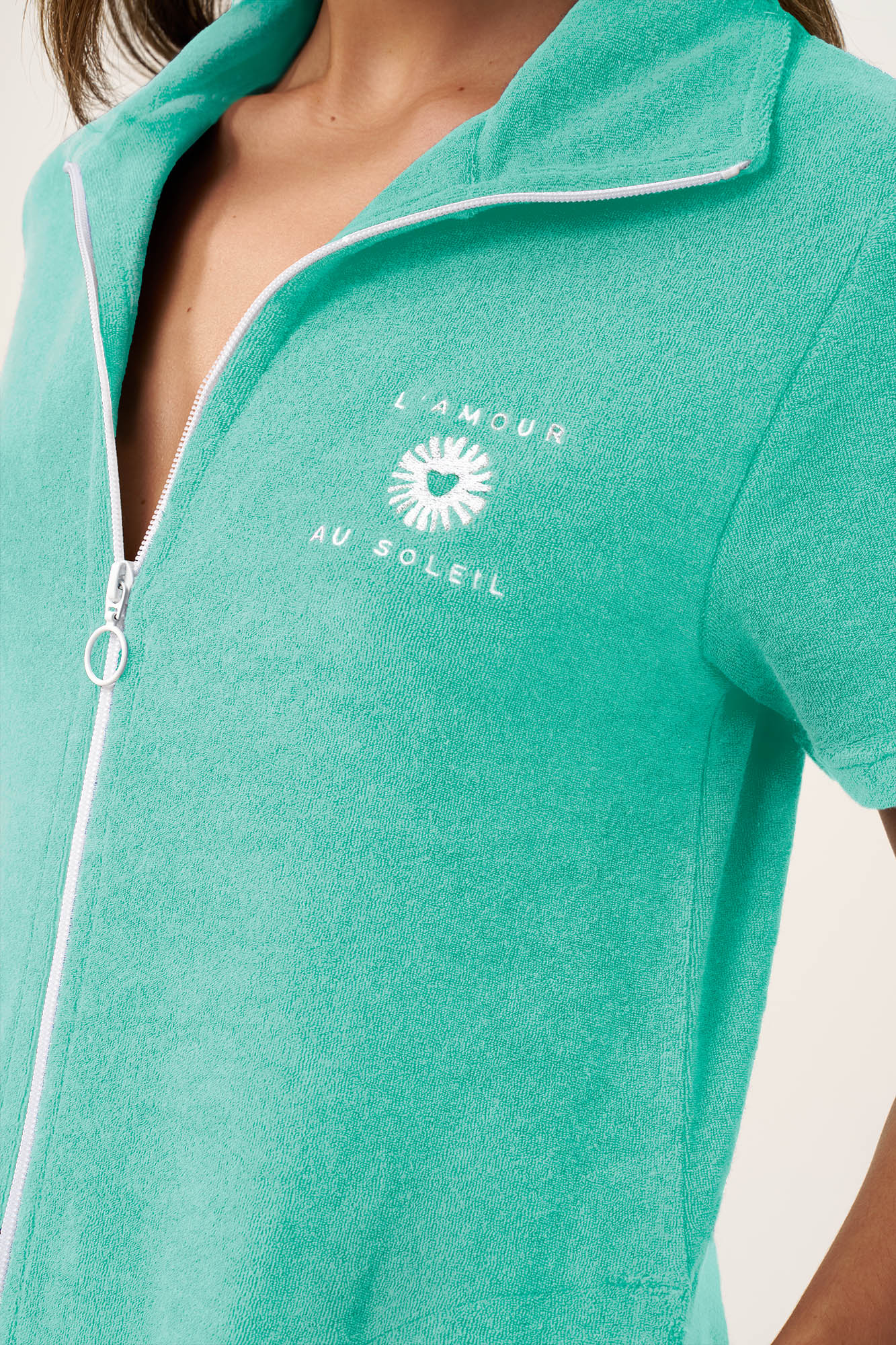 Απολαύστε τις ηλιόλουστες ημέρες με αυτό το καλοκαιρινό φόρεμα, σχεδιασμένο για απόλυτη άνεση. Κατασκευασμένο από δροσερό frottee ύφασμα με υψηλή περιεκτικότητα σε βαμβάκι, αγκαλιάζει απαλά το σώμα. Είναι σχεδιασμένο με κοντά μανίκια, γιακά, κλείνει εύκολα μπροστά με φερμουάρ και έχει πρακτικές πλαϊνές τσέπες. Ιδανικό μετά το μπάνιο ή για χαλαρές στιγμές δίπλα στη θάλασσα, αποτυπώνει τη γαλήνια απλότητα του καλοκαιριού.