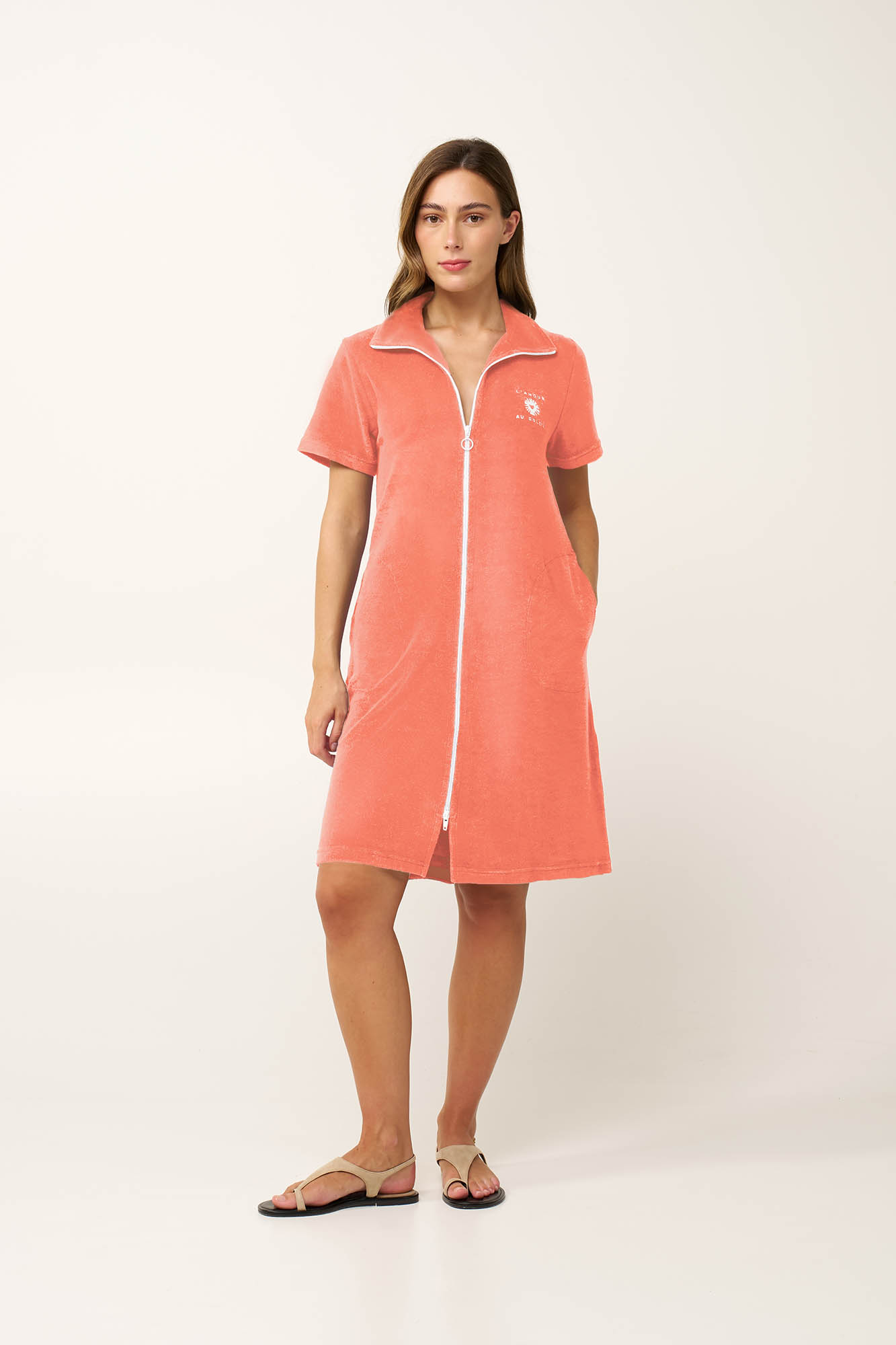 Απολαύστε τις ηλιόλουστες ημέρες με αυτό το καλοκαιρινό φόρεμα, σχεδιασμένο για απόλυτη άνεση. Κατασκευασμένο από δροσερό frottee ύφασμα με υψηλή περιεκτικότητα σε βαμβάκι, αγκαλιάζει απαλά το σώμα. Είναι σχεδιασμένο με κοντά μανίκια, γιακά, κλείνει εύκολα μπροστά με φερμουάρ και έχει πρακτικές πλαϊνές τσέπες. Ιδανικό μετά το μπάνιο ή για χαλαρές στιγμές δίπλα στη θάλασσα, αποτυπώνει τη γαλήνια απλότητα του καλοκαιριού.
