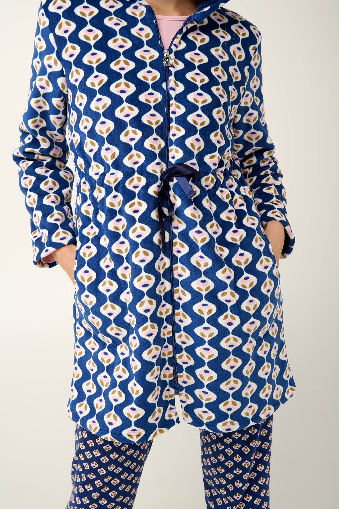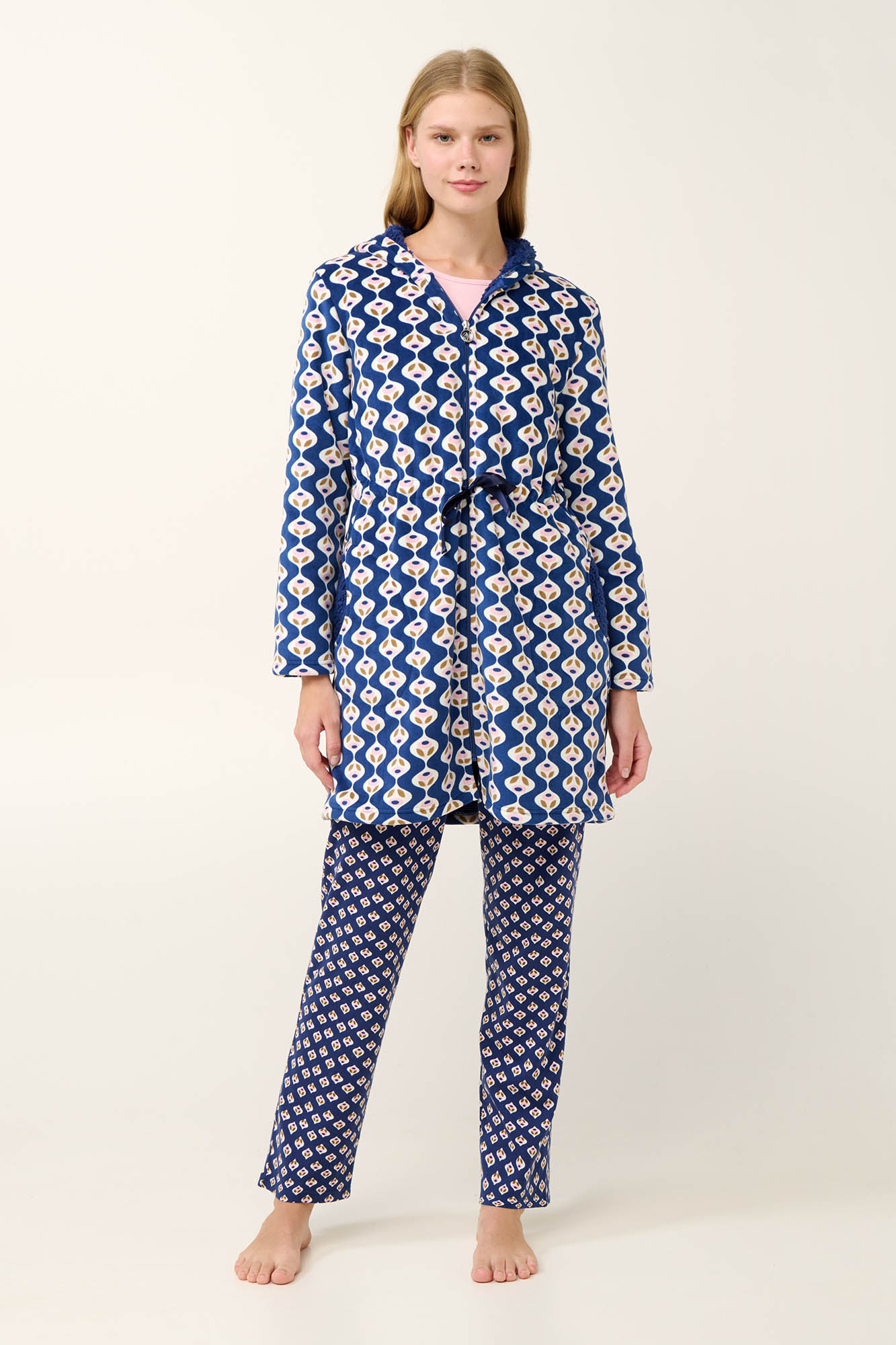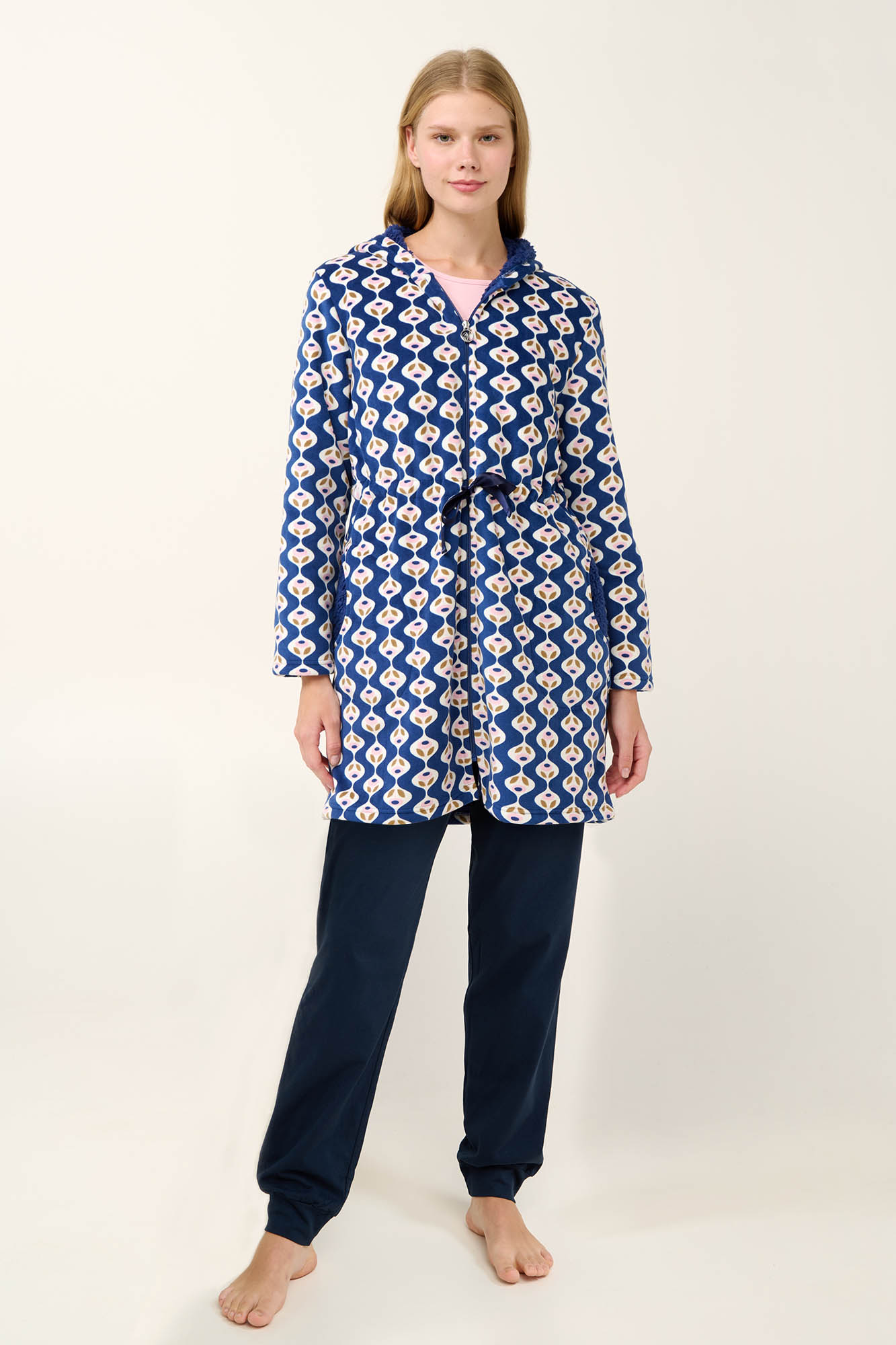 Αποκτήστε μια γυναικεία ρόμπα σε μπλε αποχρώσεις με ρουστίκ μοτίβο. Κατασκευασμένη από εξαιρετικά απαλό στο σώμα fleece, κλείνει με φερμουάρ και έχει πρακτικές τσέπες που σας βοηθούν να κρατήσετε κοντά τα προσωπικά σας αντικείμενα. Φορέστε τη κουκούλα σας και παραμείνετε ζεστή ακόμη και τις πιο κρύες ημέρες συνδυάζοντας την με την αγαπημένη σας πυτζάμα