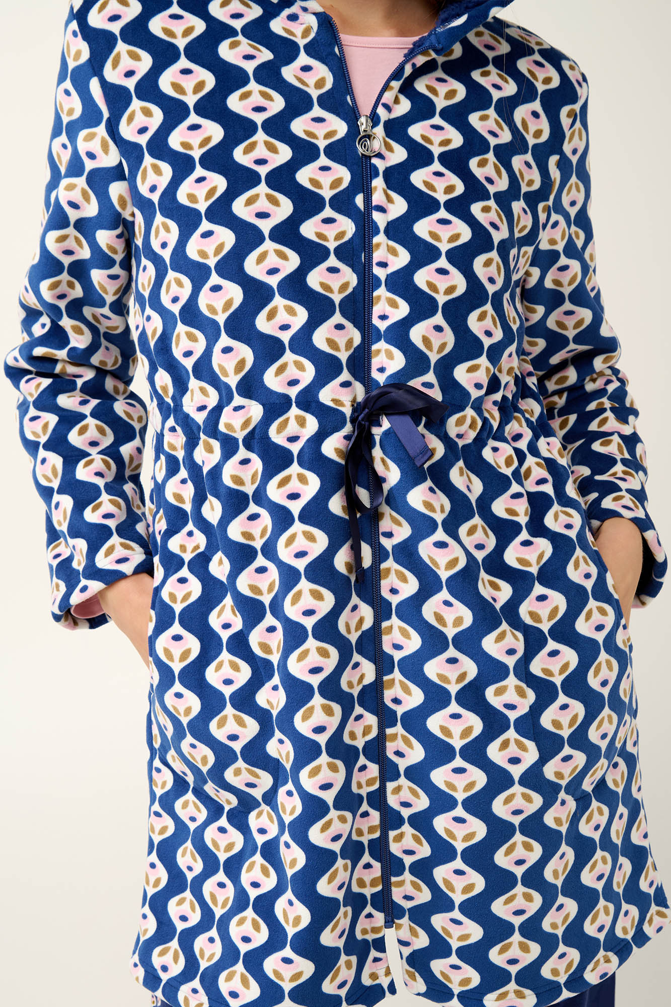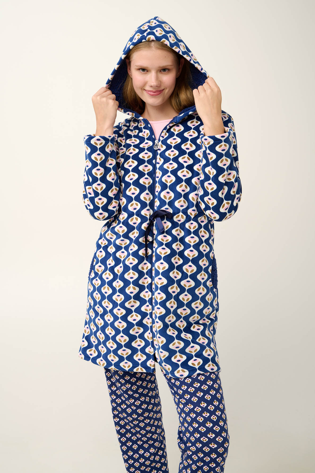 Αποκτήστε μια γυναικεία ρόμπα σε μπλε αποχρώσεις με ρουστίκ μοτίβο. Κατασκευασμένη από εξαιρετικά απαλό στο σώμα fleece, κλείνει με φερμουάρ και έχει πρακτικές τσέπες που σας βοηθούν να κρατήσετε κοντά τα προσωπικά σας αντικείμενα. Φορέστε τη κουκούλα σας και παραμείνετε ζεστή ακόμη και τις πιο κρύες ημέρες συνδυάζοντας την με την αγαπημένη σας πυτζάμα