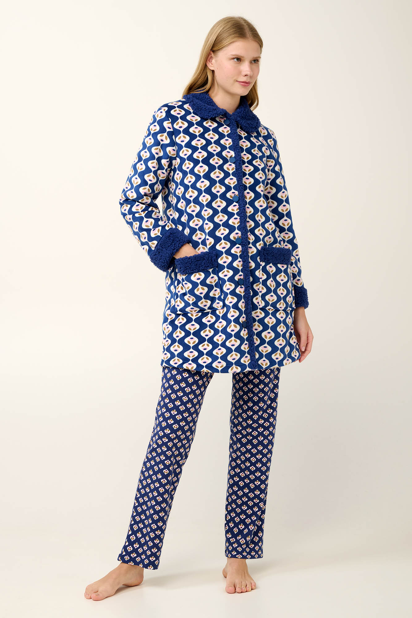 Αποκτήστε μια γυναικεία ρόμπα σε μπλε αποχρώσεις με ρουστίκ μοτίβο. Κατασκευασμένη από εξαιρετικά απαλό στο σώμα fleece, κλείνει με κουμπιά, έχει πρακτικές τσέπες που σας βοηθούν να κρατήσετε κοντά τα προσωπικά σας αντικείμενα και γιακά που δίνει κλασική κομψότητα στο σύνολο σας. Συνδυάστε τη με την αγαπημένη σας πυτζάμα για ένα ζεστό και ξεκούραστο απόγευμα στο καναπέ.