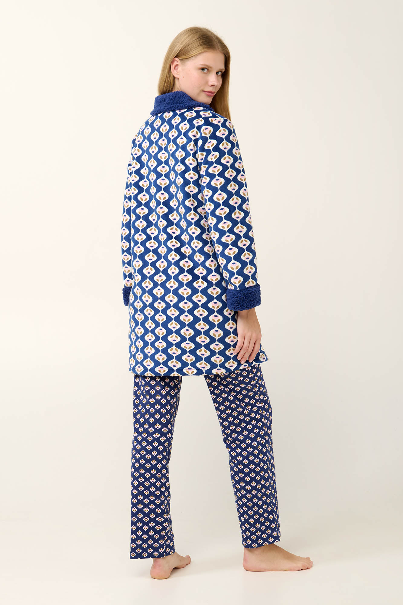 Αποκτήστε μια γυναικεία ρόμπα σε μπλε αποχρώσεις με ρουστίκ μοτίβο. Κατασκευασμένη από εξαιρετικά απαλό στο σώμα fleece, κλείνει με κουμπιά, έχει πρακτικές τσέπες που σας βοηθούν να κρατήσετε κοντά τα προσωπικά σας αντικείμενα και γιακά που δίνει κλασική κομψότητα στο σύνολο σας. Συνδυάστε τη με την αγαπημένη σας πυτζάμα για ένα ζεστό και ξεκούραστο απόγευμα στο καναπέ.