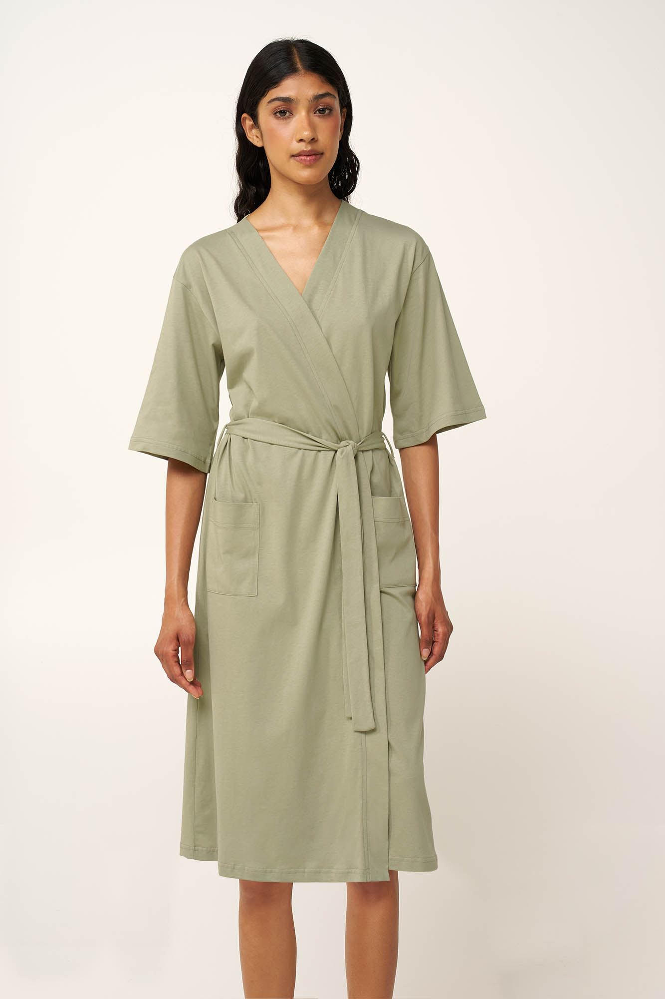 Προσθέστε στην γκαρνταρόμπα σας μια κλασική γυναικεία ρόμπα, κατασκευασμένη από απαλό και διαπνέον 100% βαμβάκι single jersey για ευχάριστη αίσθηση στο δέρμα. Σχεδιασμένη σε κλασική σταυρωτή γραμμή και πρακτικές, πλαϊνές τσέπες, κλείνει με ζώνη για βέλτιστη προσαρμοζόμενη εφαρμογή. Μονόχρωμη και διαχρονική, θα την φορέσετε πάνω από το αγαπημένο σας νυχτικό ένα δροσερό πρωινό στο μπαλκόνι ή ακόμα και στο μαιευτήριο.