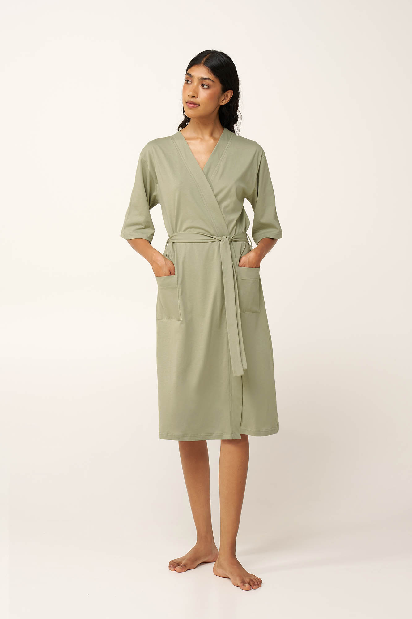 Προσθέστε στην γκαρνταρόμπα σας μια κλασική γυναικεία ρόμπα, κατασκευασμένη από απαλό και διαπνέον 100% βαμβάκι single jersey για ευχάριστη αίσθηση στο δέρμα. Σχεδιασμένη σε κλασική σταυρωτή γραμμή και πρακτικές, πλαϊνές τσέπες, κλείνει με ζώνη για βέλτιστη προσαρμοζόμενη εφαρμογή. Μονόχρωμη και διαχρονική, θα την φορέσετε πάνω από το αγαπημένο σας νυχτικό ένα δροσερό πρωινό στο μπαλκόνι ή ακόμα και στο μαιευτήριο.