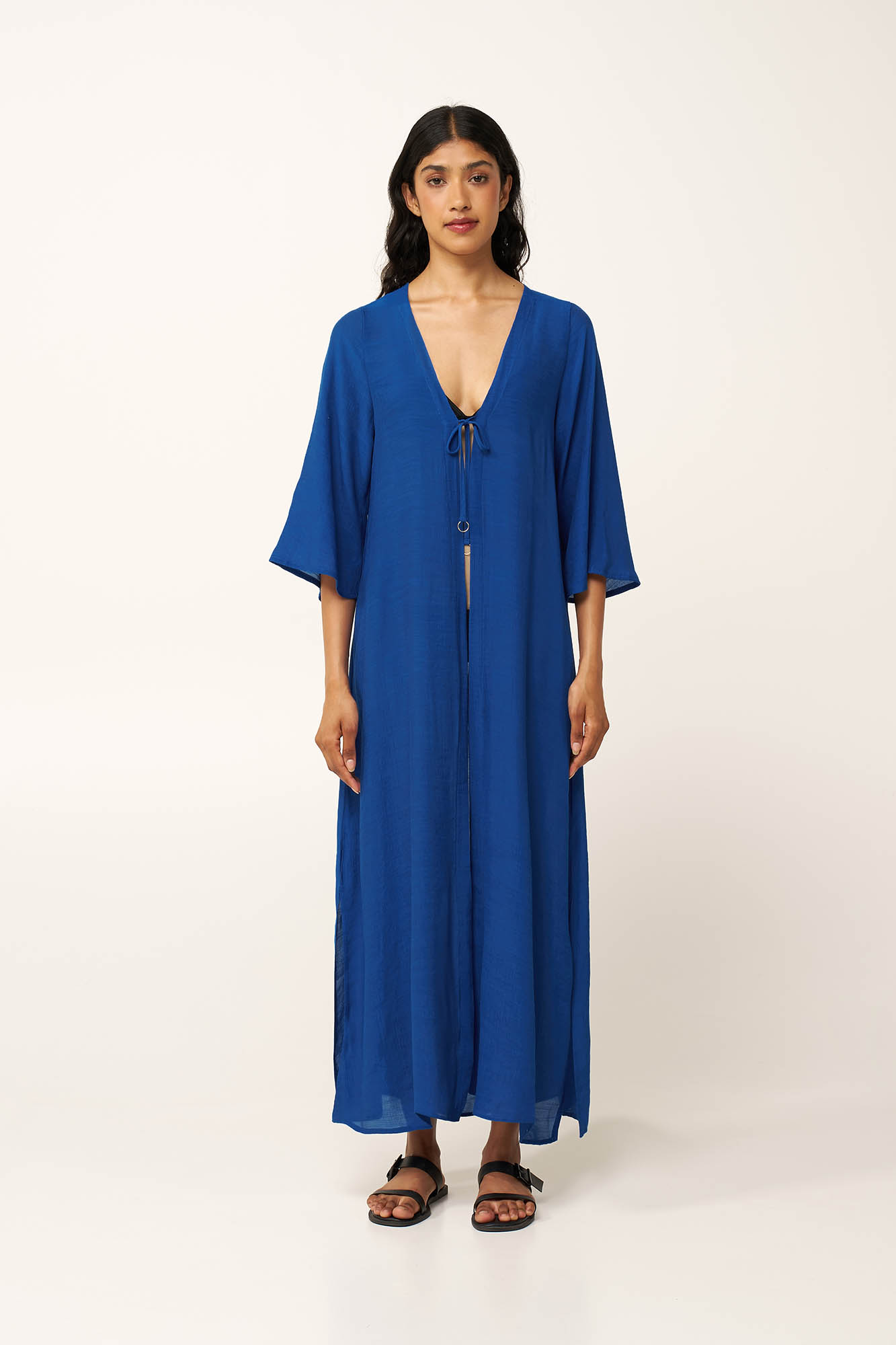 Αφεθείτε στον ρυθμρό του καλοκαιριού με αυτό το maxi φόρεμα θαλάσσης από αέρινο μείγμα γάζας με ανάγλυφη υφή. Ελαφρώς τσαλακωμένο με διακριτική διαφάνεια, είναι σχεδιασμένο με φαρδιά μανίκια και χαλαρή γραμμή, κινείται όμορφα σε κάθε σας βήμα. Δέστε το στο στήθος ή φορέστε το ανοιχτό πάνω από το μαγιό από το πρωί στη παραλία μέχρι το ηλιοβασίλεμα.
