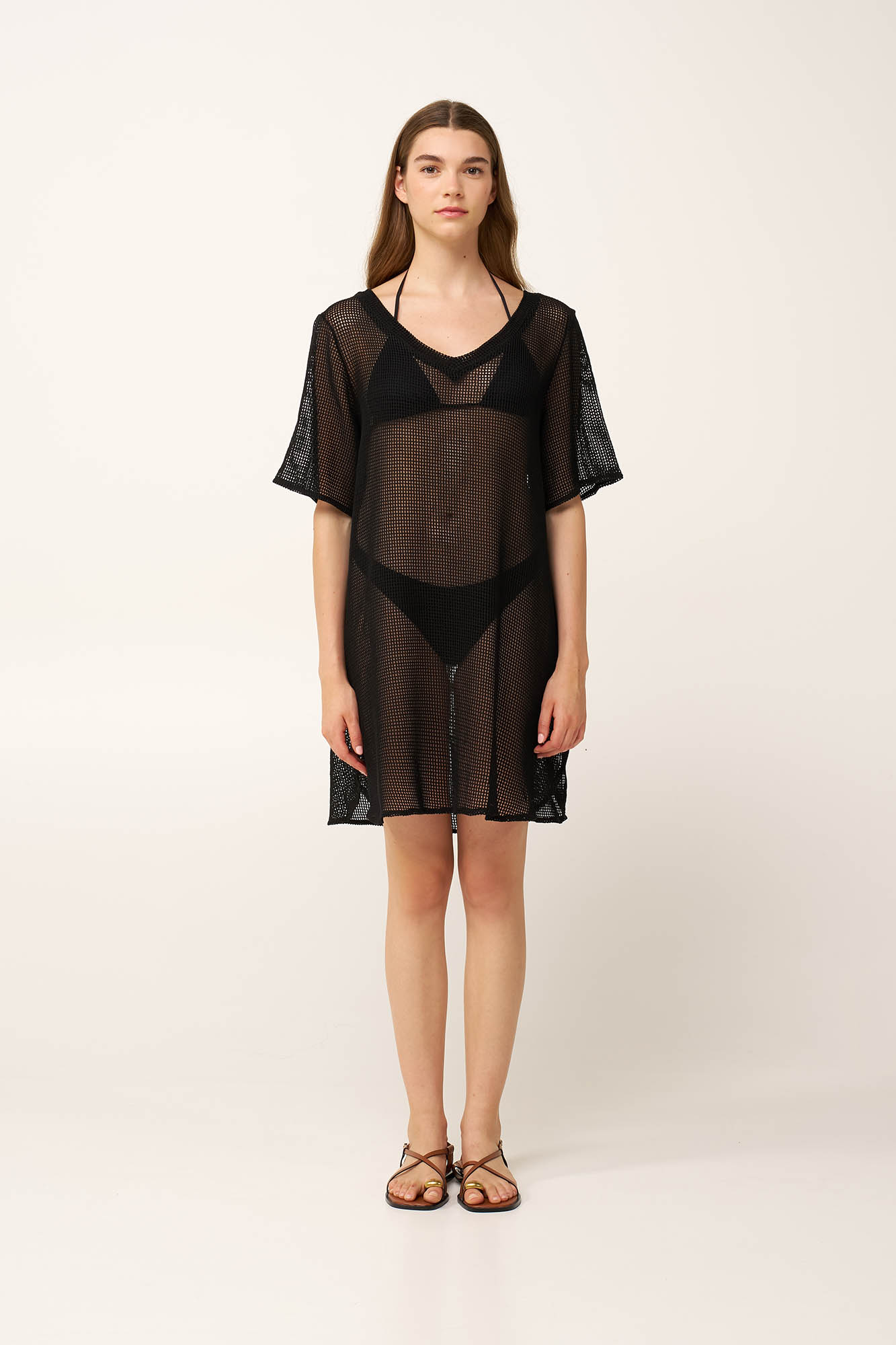 Εντυπωσιακό και τολμηρό, αυτό το see through φόρεμα παραλίας είναι κατασκευασμένο ελαφρύ, μαύρο mesh ύφασμα. Η λαιμόκοψη V δένει στην πλάτη, ενώ η χαλαρή γραμμή, του επιτρέπει να πέφτει απαλά στο σώμα. Φορέστε το με αυτοπεποίθηση πάνω από το μαγίο σας ή ως layering κομμάτι, στη παραλία ή μια βόλτα στις καλοκαιρινές σας διακοπές.