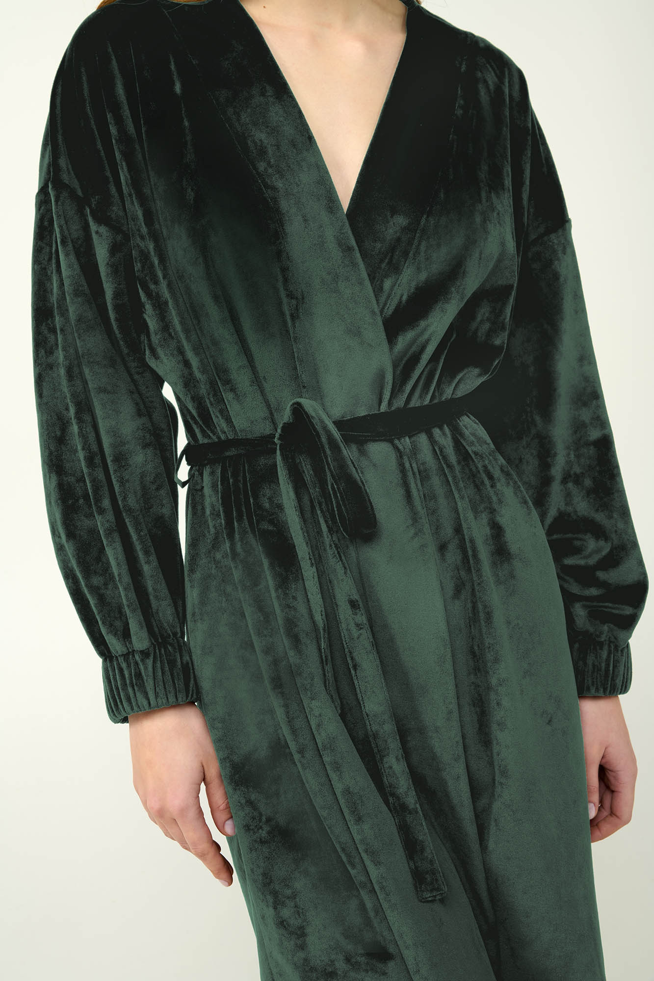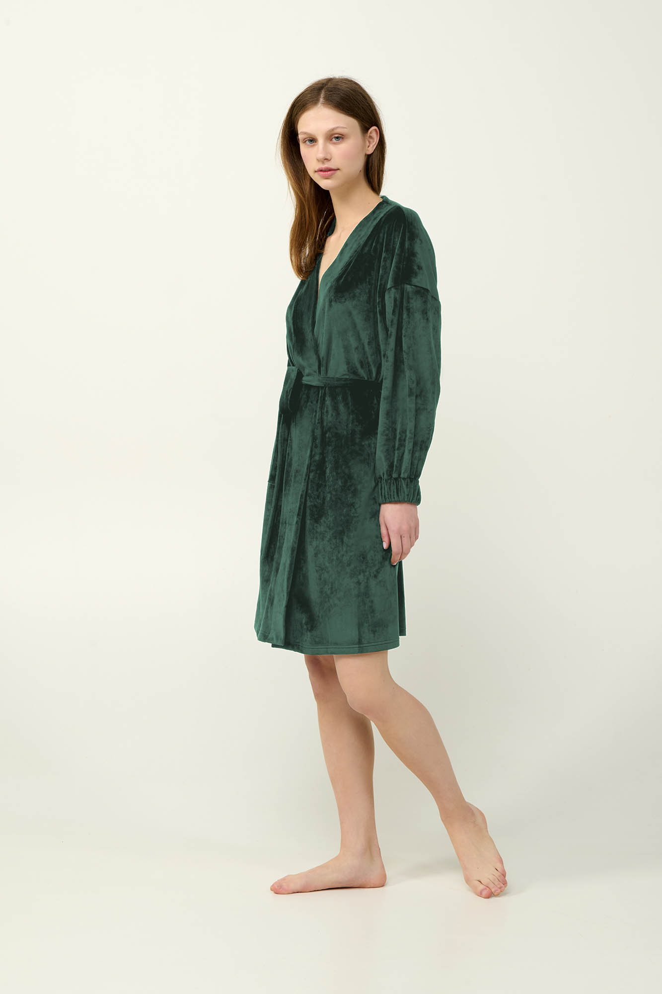 Αφεθείτε στη πολυτέλεια που σας προσφέρει μια μονόχρωμη γυναικεία ρόμπα από απαλό και ελαστικό βελούδο, σχεδιασμένη σε κλασικό σταυρωτό πατρόν με ζώνη και μανίκια με μανσέτες για άνετη ερμογή και ιδιαίτερο στυλ. Φορέστε τη ρόμπα σας κλείνοντας την με την άνετη μακριά ζώνη της ή ανοιχτή για πιο ανάλαφρο look και συμπληρώστε το σύνολο σας.