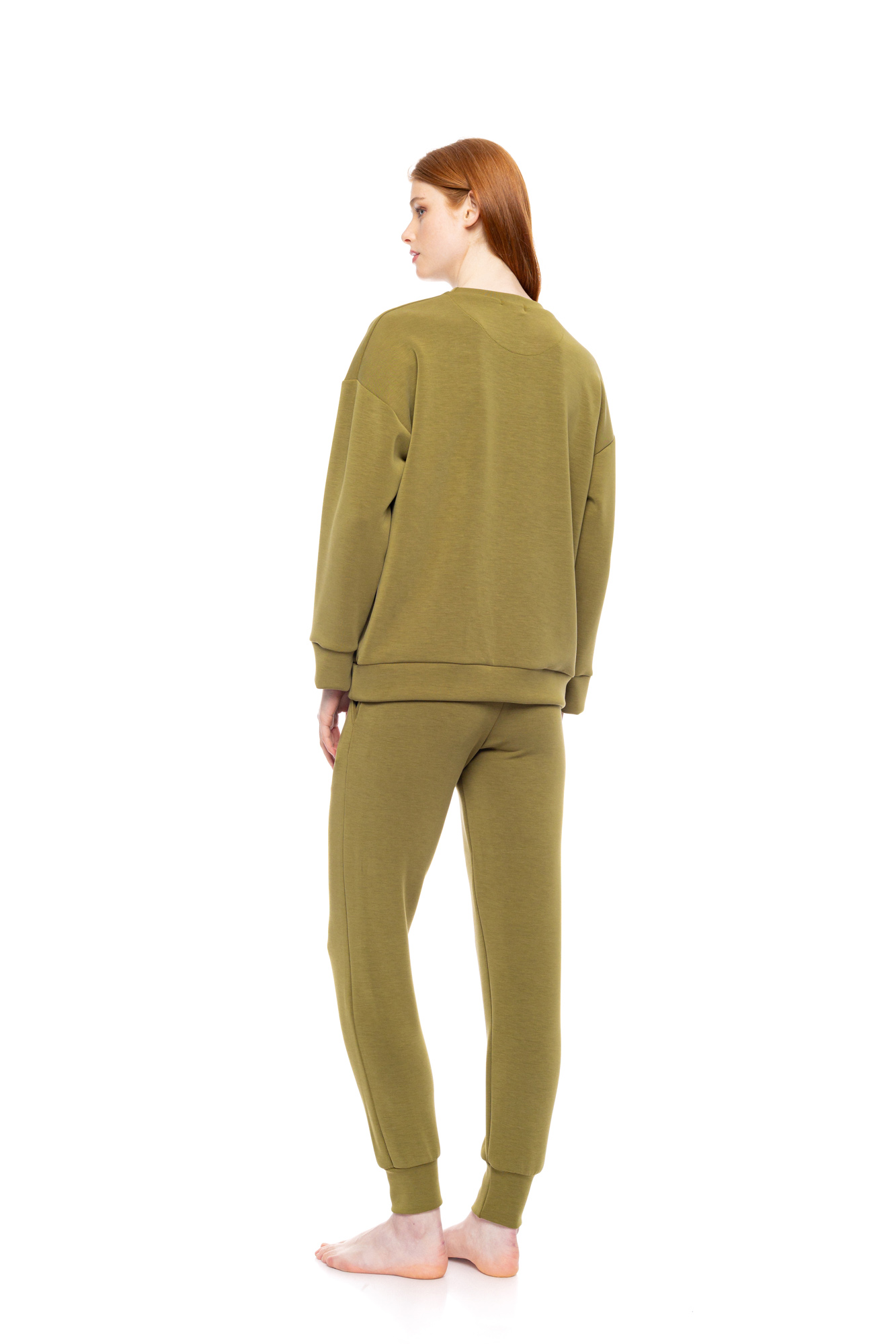 Γυναικεία φόρμα Pink Label. Λαδί μακρυμάνικη με λάστιχο στα τελείωματα της μπλούζας και εντυπωσιακά πλούσια μανίκια. Μακρύ μονόχρωμο παντελόνι σε ίσια γραμμή με μαλακό λάστιχο στην μέση και στους αστραγάλους.
