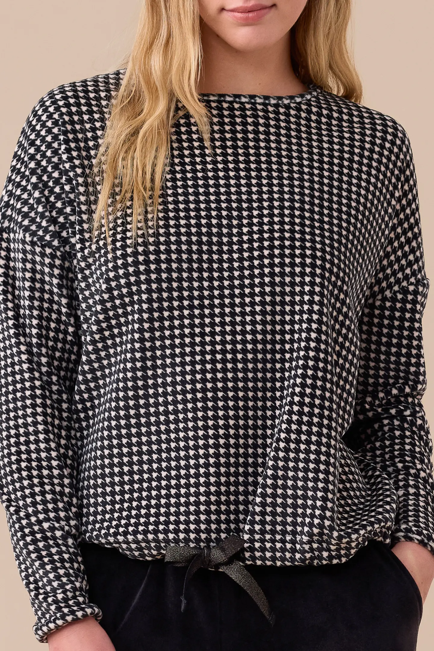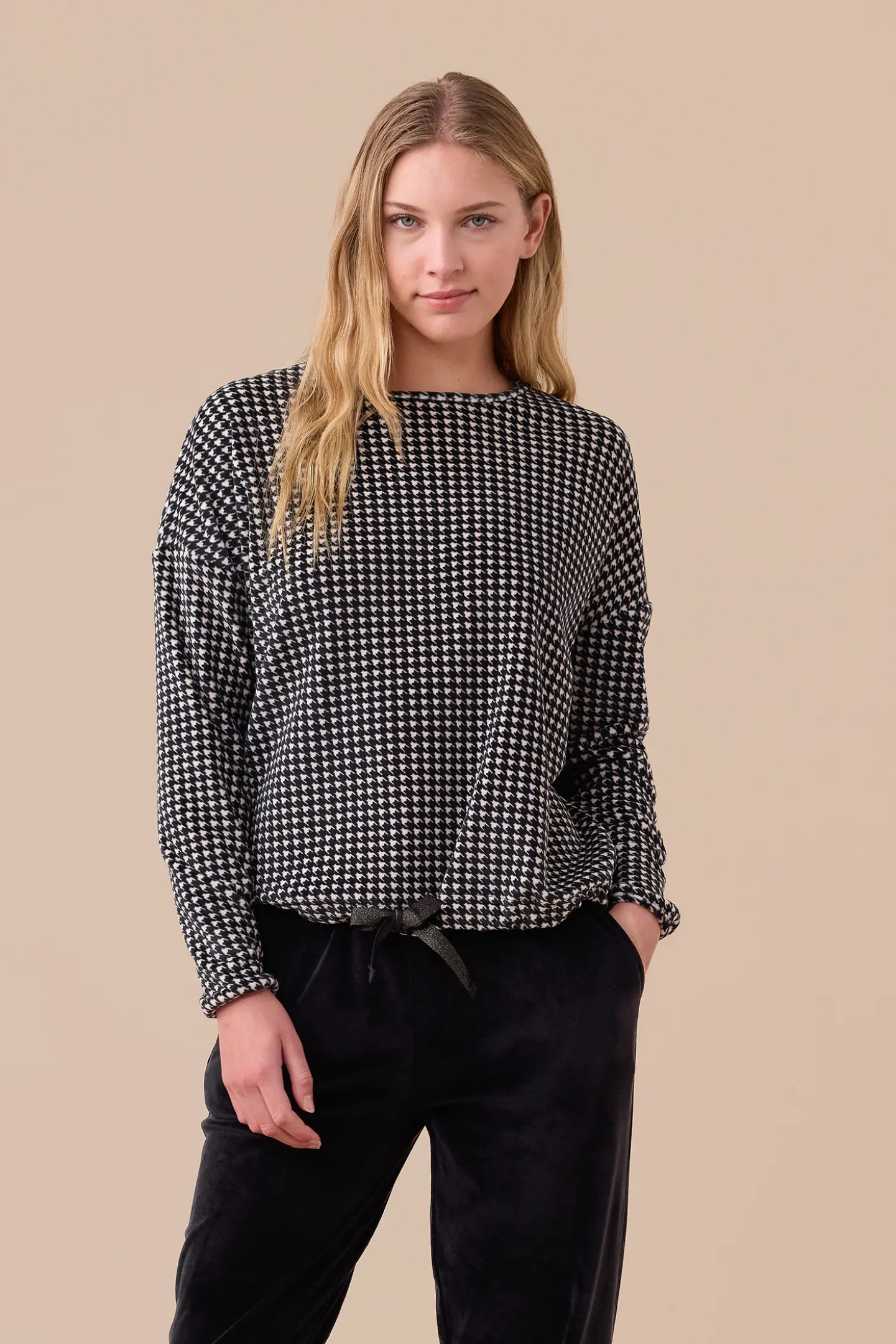 Γυναικεία χειμωνιάτικη πυτζάμα Noidinotte βελουτέ. Νεανικό Homewear Set πολύ ζεστό και απαλό. Μπλούζα Pied De Poule Print με στρογγυλή λαιμόκοψη και βελούδινη λέξη μπροστά. Παντελόνι μαύρο με μαλακό λάστιχο στην μέση, τσέπες και μανσέτες στα μπατζάκια.