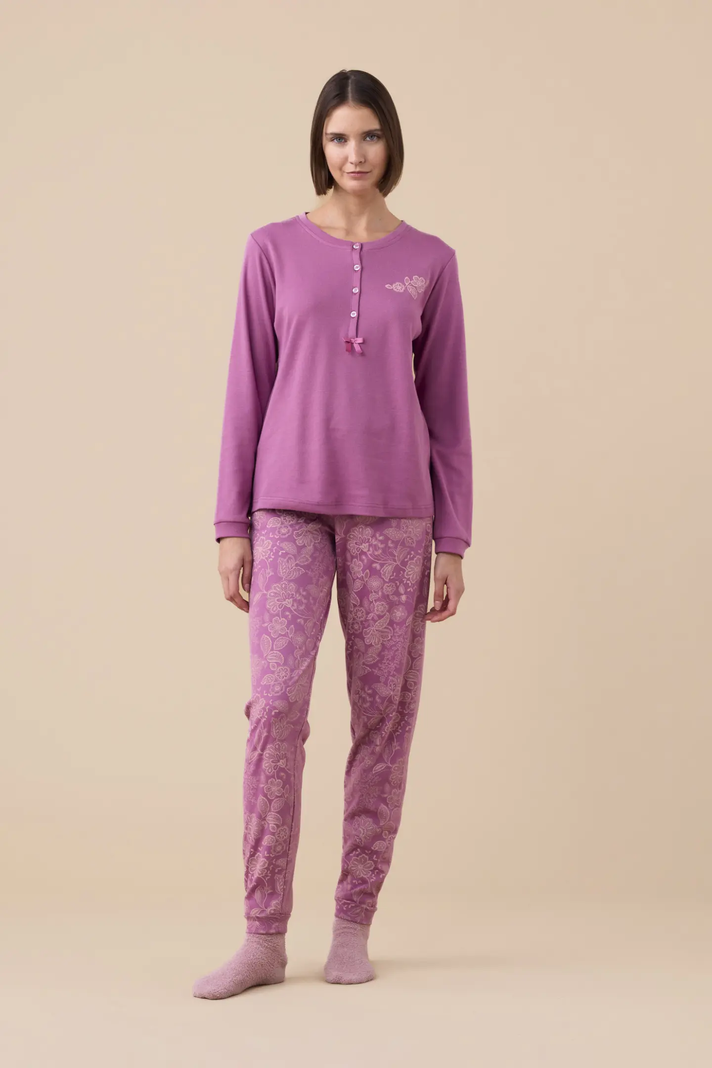 Γυναικεία χειμωνιάτικη πυτζάμα Noidinotte βαμβακερή. Νεανικό Homewear Set με μακρύ μανίκι. Μπλούζα λιλά με στρογγυλή λαιμόκοψη κουμπάκια και print με λουλούδια . Παντελόνι ροζ με σχέδιο και μαλακό λάστιχο στην μέση.