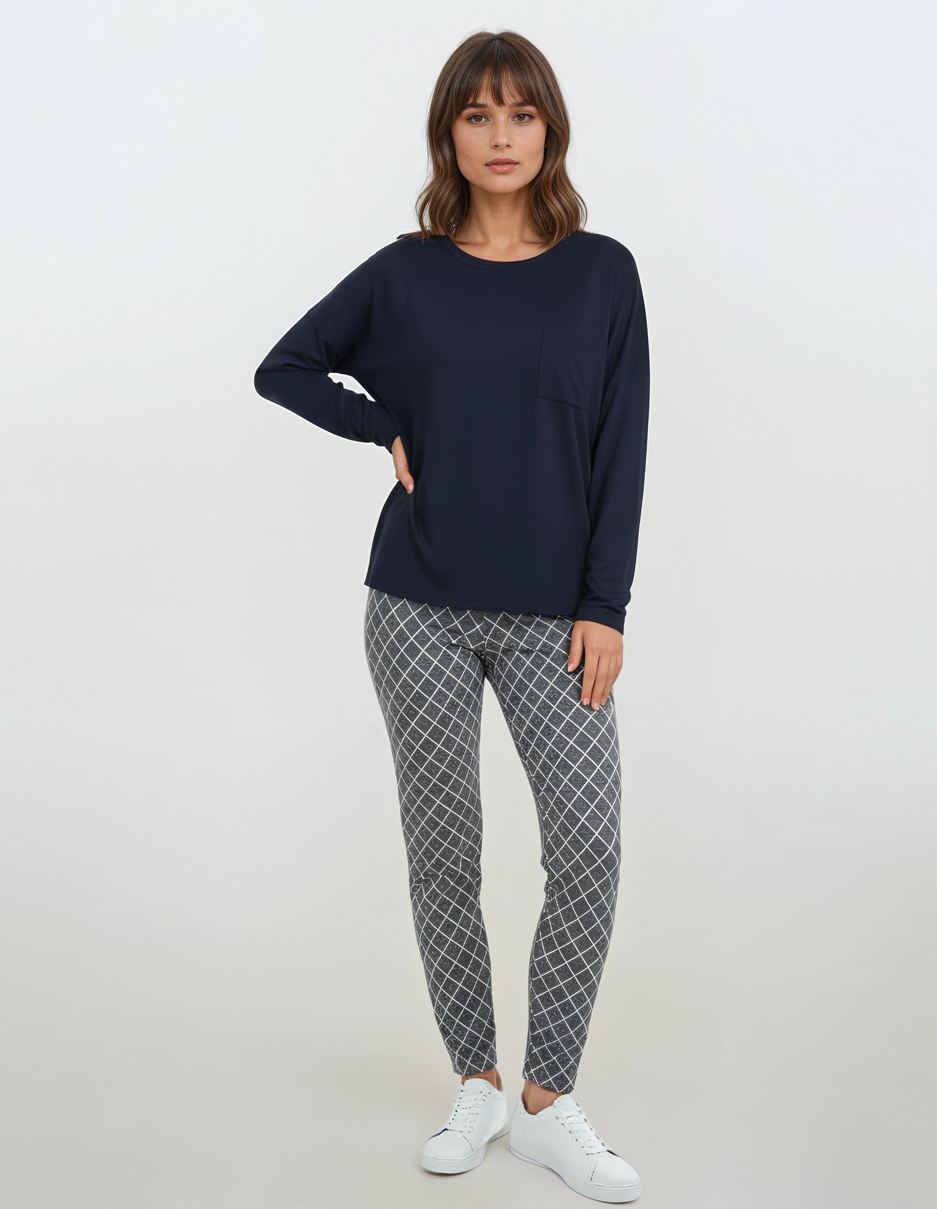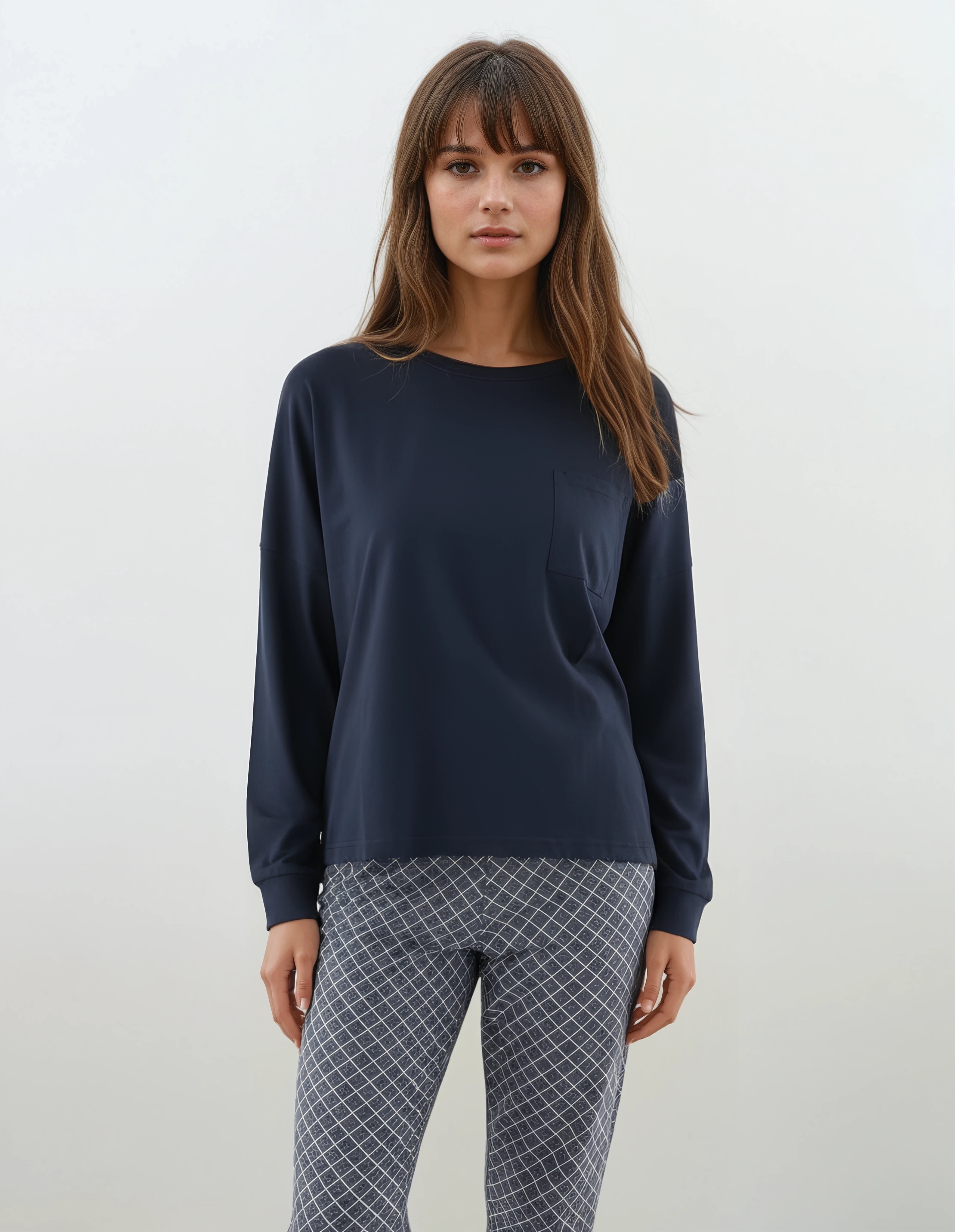 Γυναικεία πυτζάμα Pink Label. Navy μακρυμάνικη μπλούζα με εμπριμέ παντελόνι σε ίσια γραμμή με μαλακό λάστιχο στην μέση.