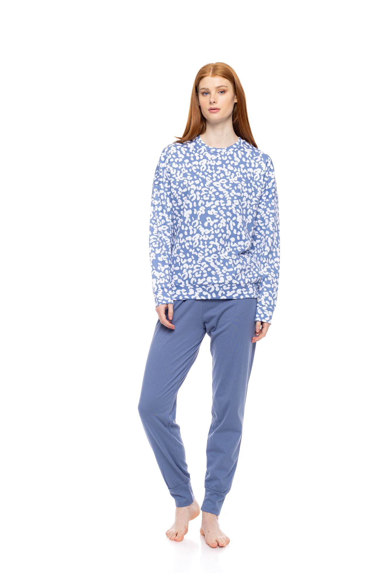 Γυναικεία πυτζάμα Pink Label με λάστιχο στα τελειώματα. Μακρυμάνικη μπλούζα blue leopard print. Μακρύ μπλε παντελόνι σε ίσια γραμμή με μαλακό λάστιχο στην μέση και στους αστραγάλους.
