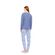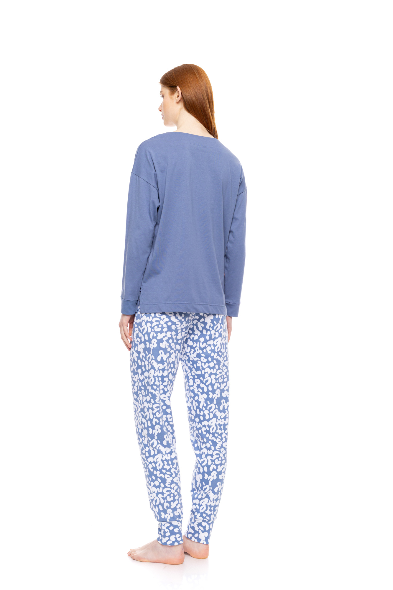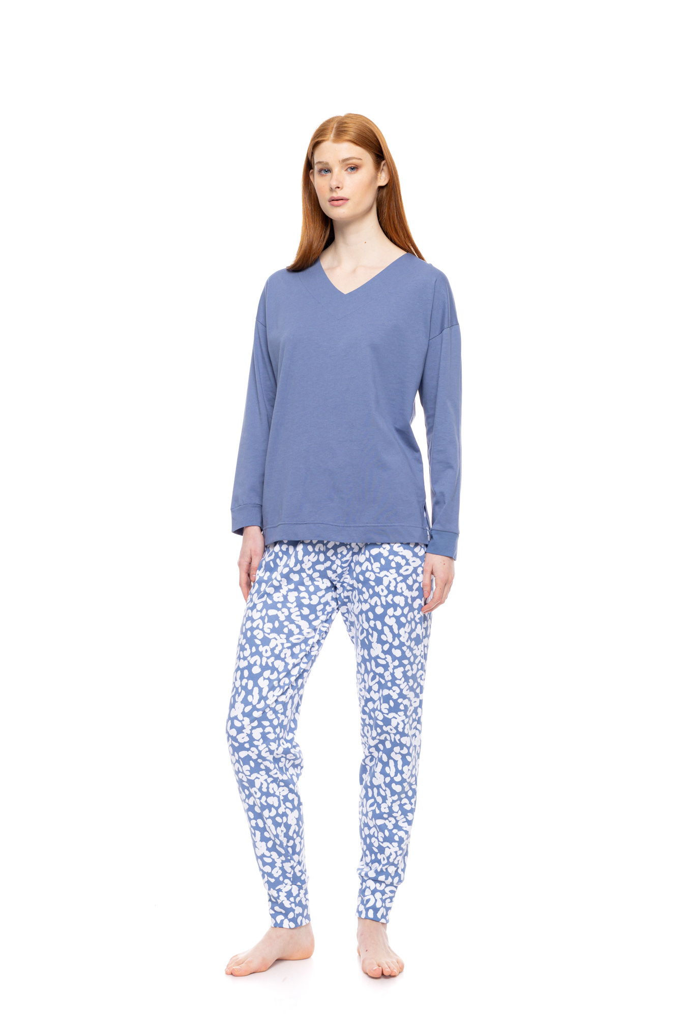 Γυναικεία πυτζάμα Pink Label. Μπλε μακρυμάνικη μπλούζα με V λαιμόκοψη και μανσέτες. Μακρύ παντελόνι Leo Print σε ίσια γραμμή με μαλακό λάστιχο στην μέση και στους αστραγάλους.