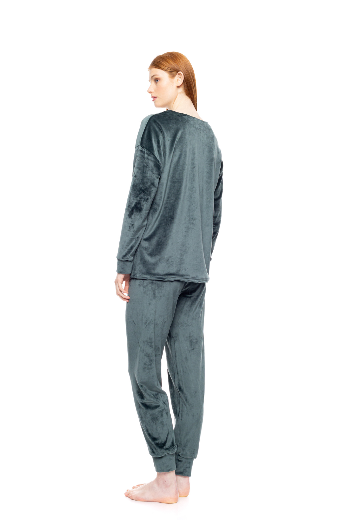 Γυναικεία πυτζάμα βελουτέ Pink Label. Κυπαρισσί μακρυμάνικη μπλούζα με V λαιμόκοψη και τσέπη στο στήθος. Μακρύ παντελόνι Dark Green σε ίσια γραμμή με μαλακό λάστιχο στην μέση και στους αστραγάλους.