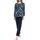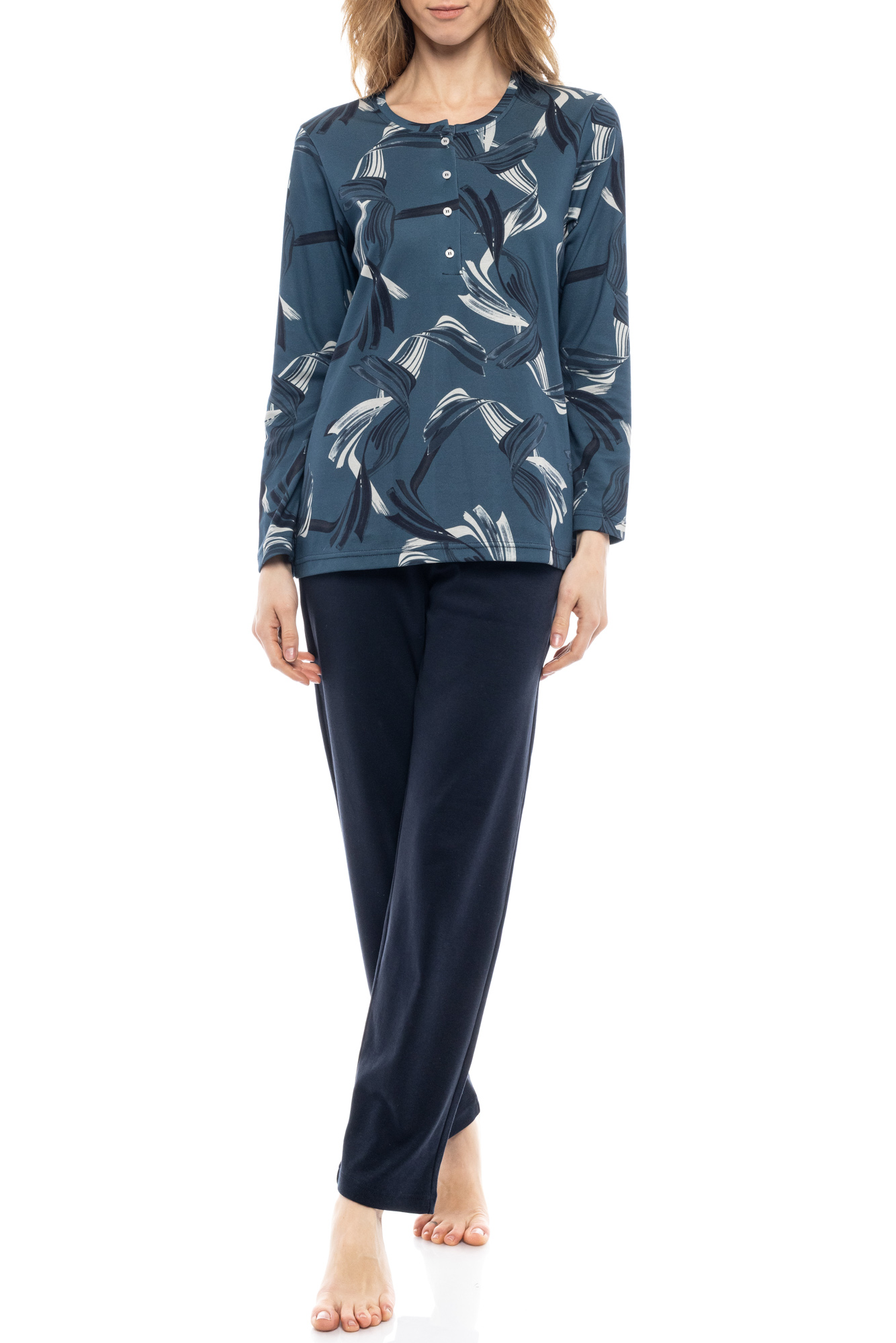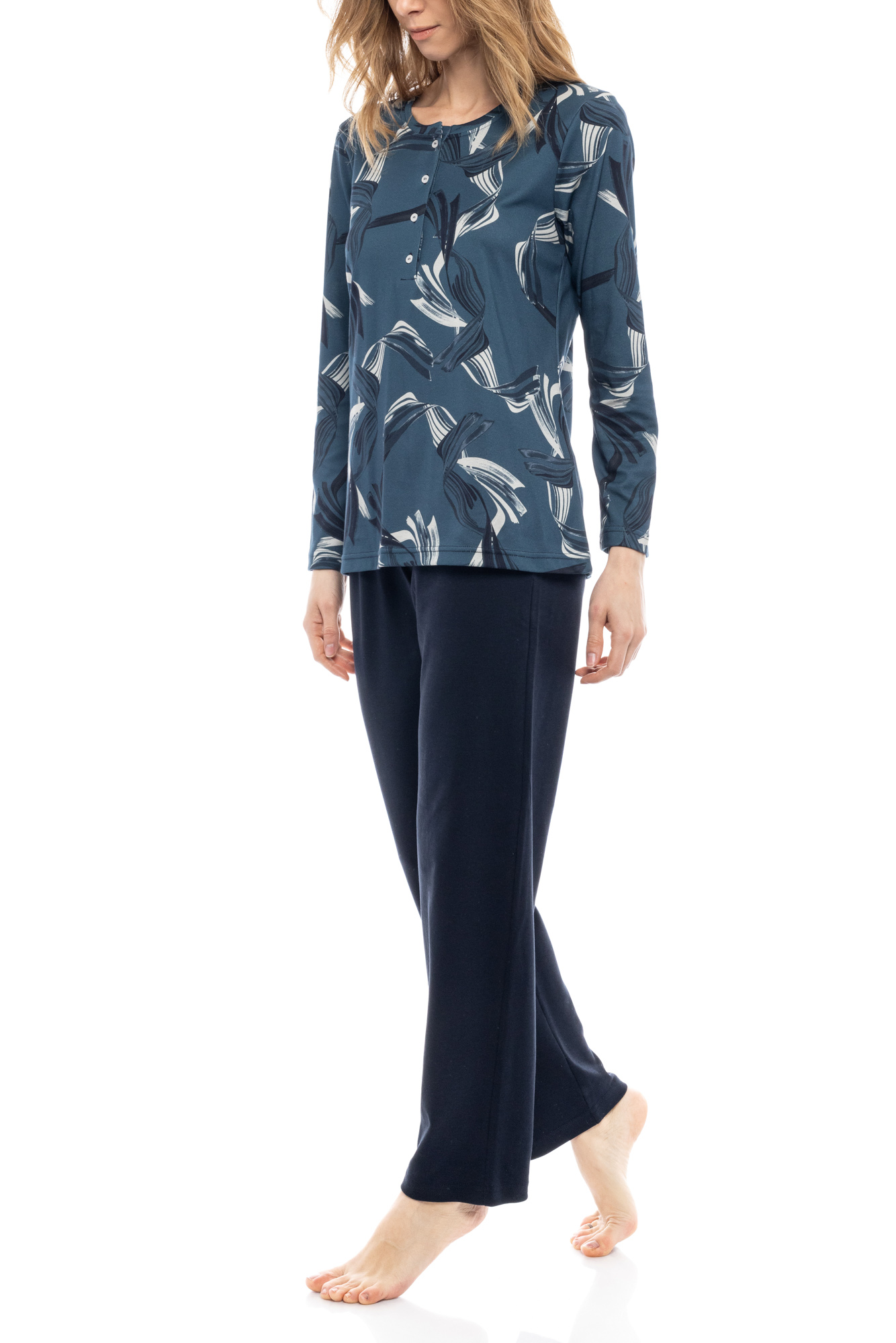 Γυναικεία πυτζάμα Pink Label. Μπλε εμπριμέ μακρυμάνικη μπλούζα με κουμπιά στο στήθος. Μακρύ σκούρο μπλε παντελόνι σε ίσια γραμμή με μαλακό λάστιχο στην μέση.