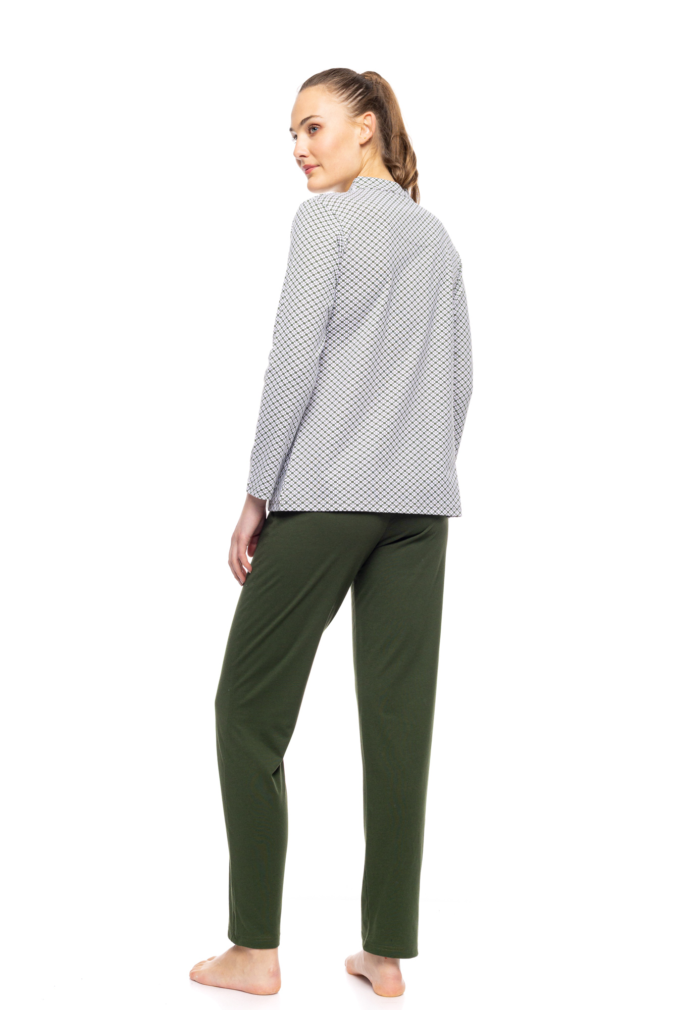 Γυναικεία Πυτζάμα Pink Label - Γεωμετρικό print - Cotton - Με Πατιλέτα - Regular Fit. Εμπριμέ μπλούζα μακρυμάνικη με μάο γιακά . Μονόχρωμο παντελόνι σε ίσια γραμμή.