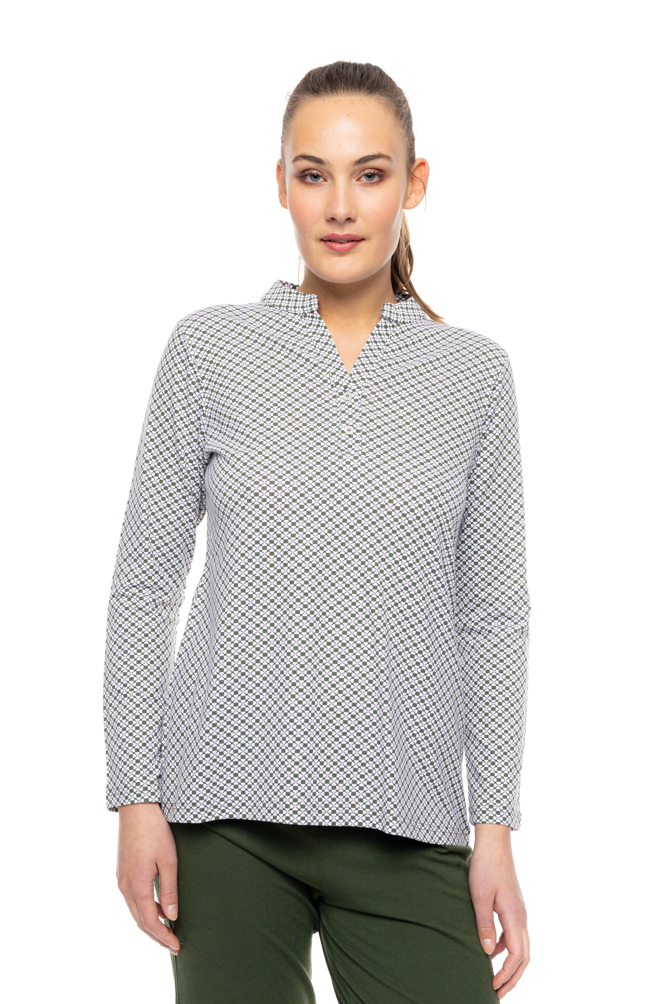 Γυναικεία Πυτζάμα Pink Label - Γεωμετρικό print - Cotton - Με Πατιλέτα - Regular Fit. Εμπριμέ μπλούζα μακρυμάνικη με μάο γιακά . Μονόχρωμο παντελόνι σε ίσια γραμμή.