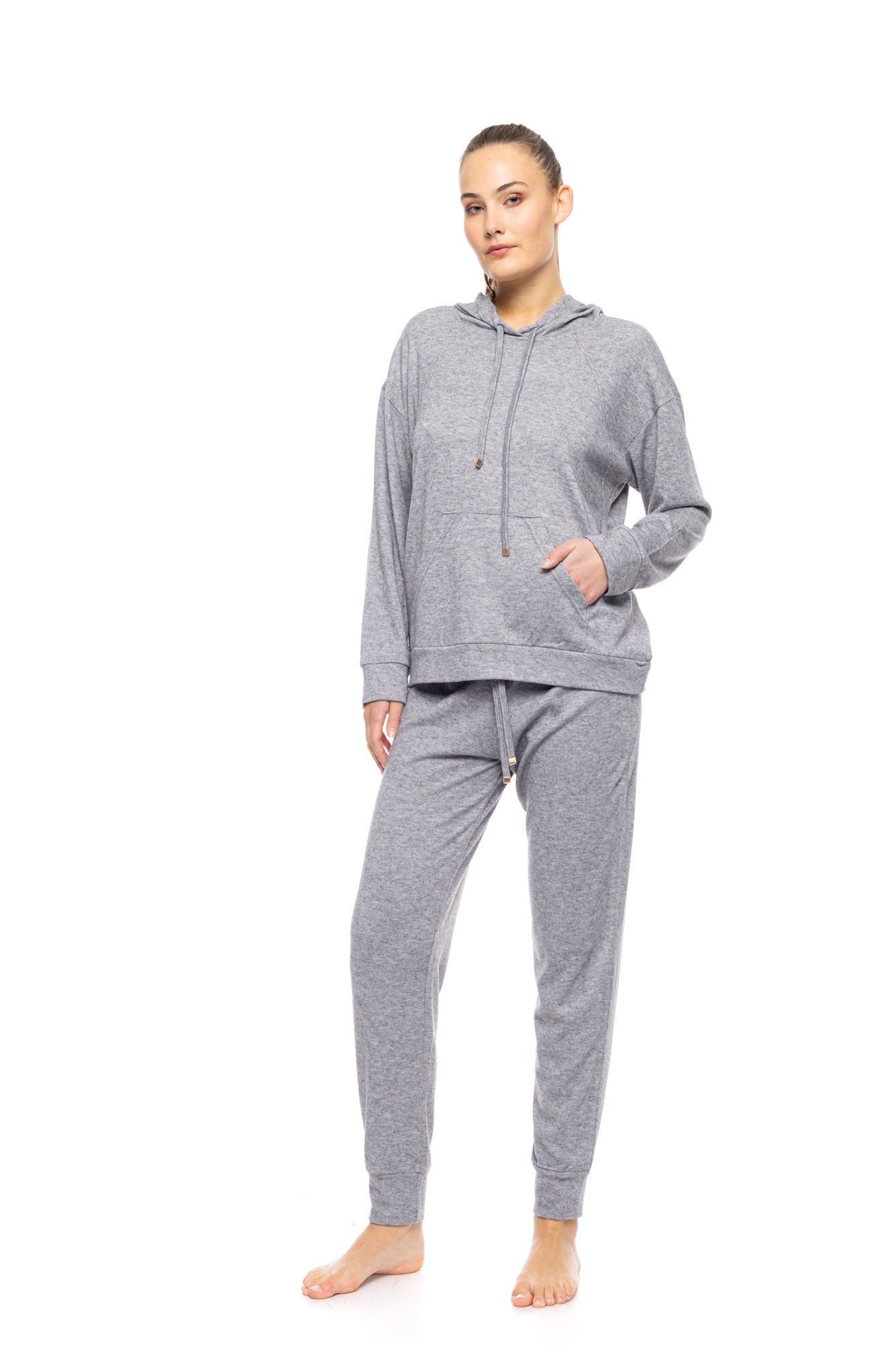 Γυναικεία πυτζάμα Pink Label γκρι με λάστιχο στα τελειώματα. Μακρυμάνικη μπλούζα με κουκούλα και τσέπη μπροστά. Μακρύ παντελόνι σε ίσια γραμμή με μαλακό λάστιχο στην μέση και στους αστραγάλους.